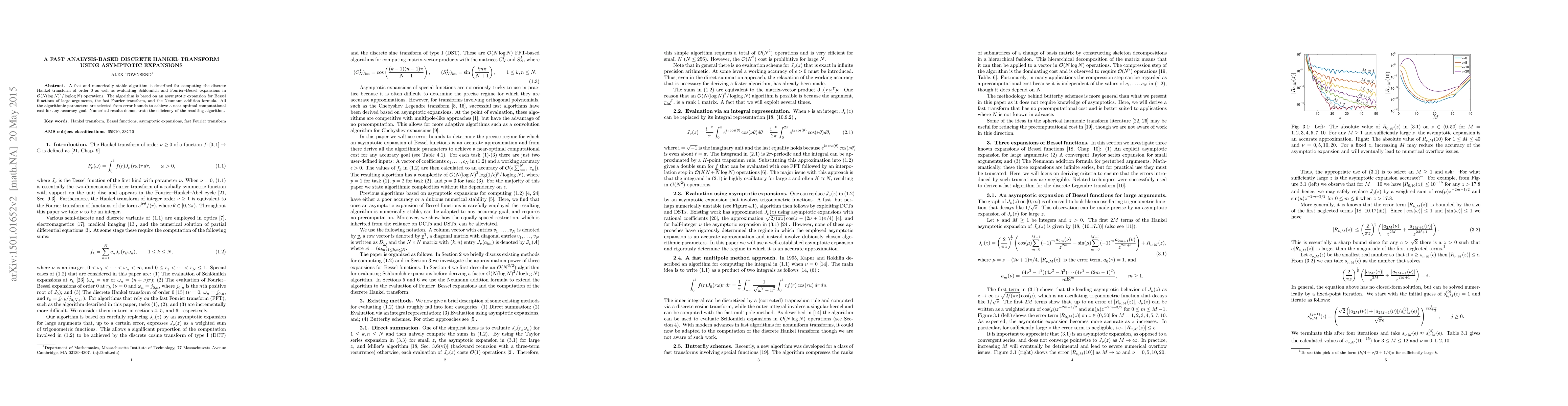 A fast and numerically stable algorithm is described for computing the discrete Hankel transform of order $0$ as well as evaluating Schl\"{o}milch and Fourier--Bessel expansions in $\mathcal{O}(N(\log N)^2/\log\!\log N)$ operations. The algorithm is based on an asymptotic expansion for Bessel functions of large arguments, the fast Fourier transform, and the Neumann addition formula. All the algorithmic parameters are selected from error bounds to achieve a near-optimal computational cost for any accuracy goal. Numerical results demonstrate the efficiency of the resulting algorithm.
