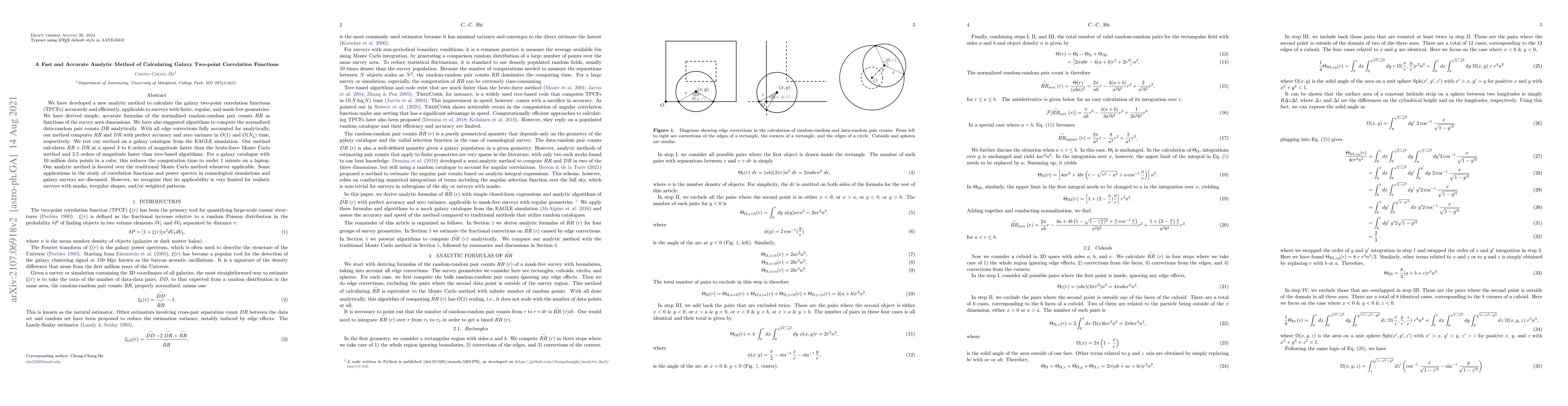 We have developed a new analytic method to calculate the galaxy two-point correlation functions (TPCFs) accurately and efficiently, applicable to surveys with finite, regular, and mask-free geometries. We have derived simple, accurate formulas of the normalized random-random pair counts $RR$ as functions of the survey area dimensions. We have also suggested algorithms to compute the normalized data-random pair counts $DR$ analytically. With all edge corrections fully accounted for analytically, our method computes $RR$ and $DR$ with perfect accuracy and zero variance in $O(1)$ and $O(N_{\rm g})$ time, respectively. We test our method on a galaxy catalogue from the EAGLE simulation. Our method calculates $RR+DR$ at a speed 3 to 6 orders of magnitude faster than the brute-force Monte Carlo method and 2.5 orders of magnitude faster than tree-based algorithms. For a galaxy catalogue with 10 million data points in a cube, this reduces the computation time to under 1 minute on a laptop. Our analytic method is favored over the traditional Monte Carlo method whenever applicable. Some applications in the study of correlation functions and power spectra in cosmological simulations and galaxy surveys are discussed. However, we recognize that its applicability is very limited for realistic surveys with masks, irregular shapes, and/or weighted patterns.