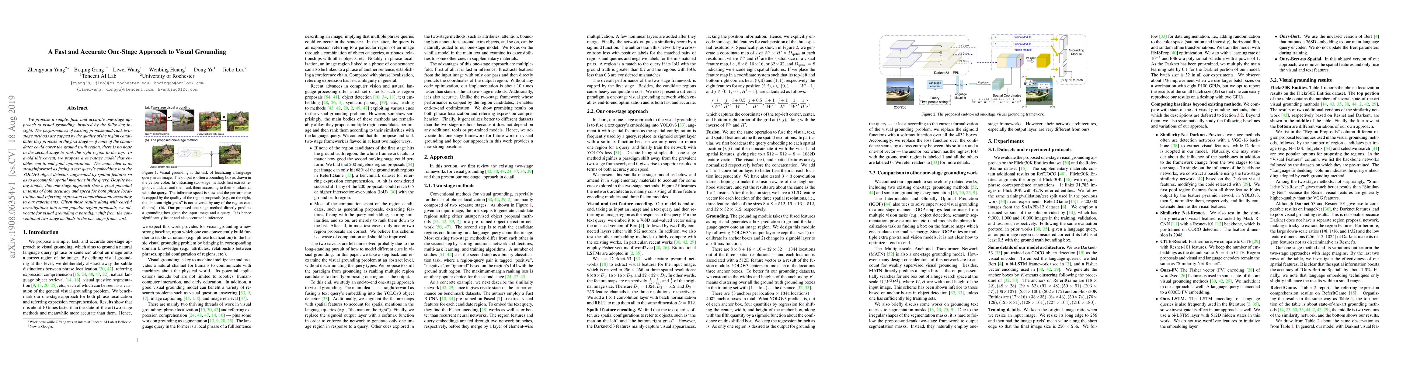 This paper proposes a fast and accurate one-stage approach for visual grounding, advocating for a paradigm shift from traditional two-stage methods. The approach integrates text query embeddings directly into a YOLOv3 object detector, achieving high accuracy and speed in phrase localization and referring expression comprehension.