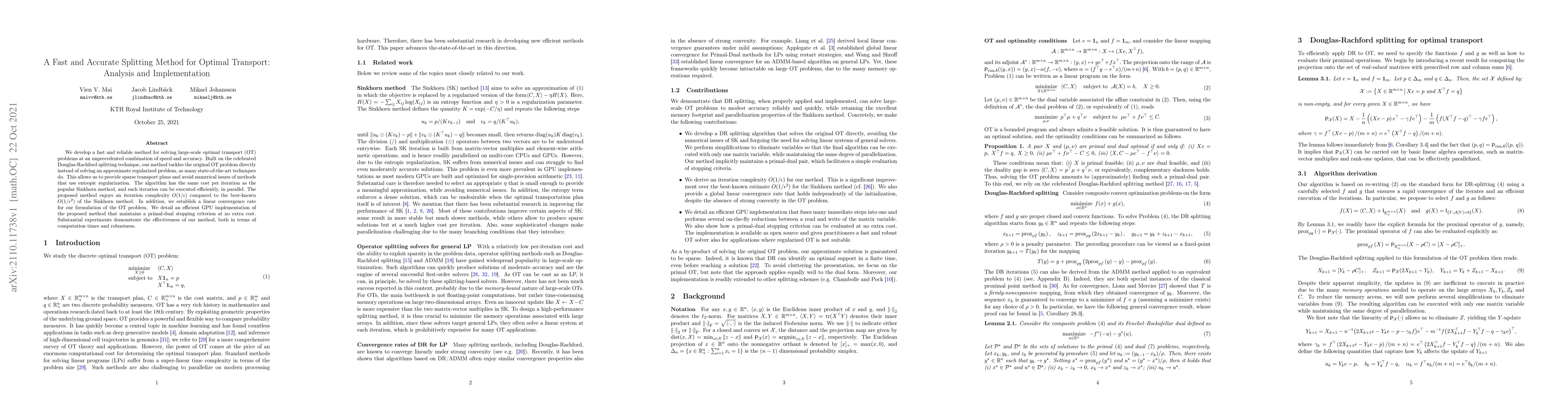 We develop a fast and reliable method for solving large-scale optimal transport (OT) problems at an unprecedented combination of speed and accuracy. Built on the celebrated Douglas-Rachford splitting technique, our method tackles the original OT problem directly instead of solving an approximate regularized problem, as many state-of-the-art techniques do. This allows us to provide sparse transport plans and avoid numerical issues of methods that use entropic regularization. The algorithm has the same cost per iteration as the popular Sinkhorn method, and each iteration can be executed efficiently, in parallel. The proposed method enjoys an iteration complexity $O(1/\epsilon)$ compared to the best-known $O(1/\epsilon^2)$ of the Sinkhorn method. In addition, we establish a linear convergence rate for our formulation of the OT problem. We detail an efficient GPU implementation of the proposed method that maintains a primal-dual stopping criterion at no extra cost. Substantial experiments demonstrate the effectiveness of our method, both in terms of computation times and robustness.
