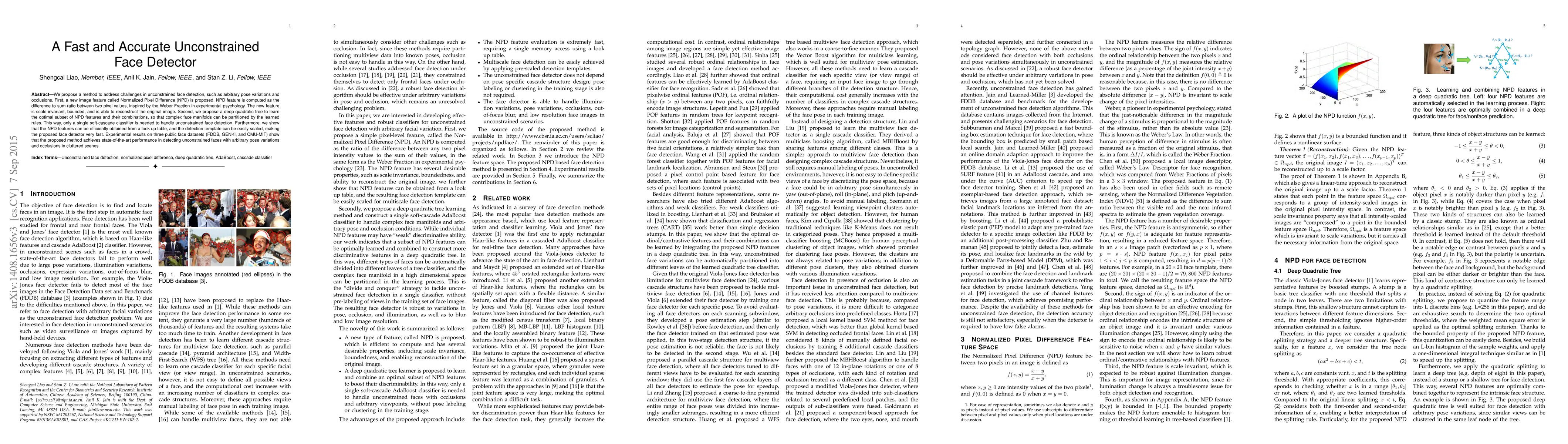 This paper introduces a novel Normalized Pixel Difference (NPD) feature and a deep quadratic tree-based classifier for fast and accurate unconstrained face detection, addressing challenges like pose variations and occlusions. The method achieves state-of-the-art performance on multiple datasets.