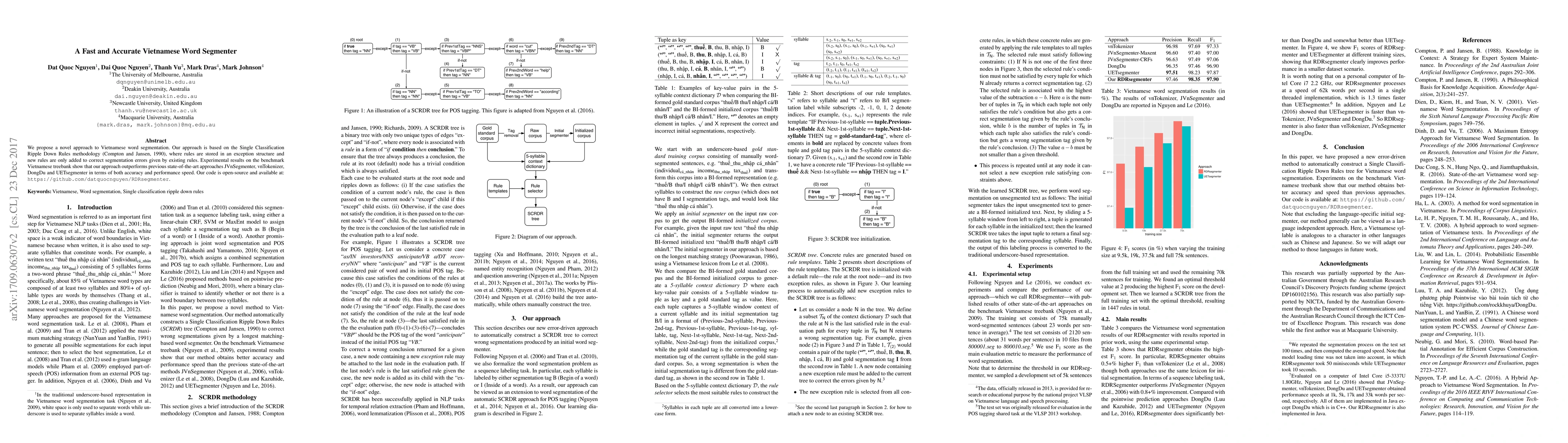 We propose a novel approach to Vietnamese word segmentation. Our approach is based on the Single Classification Ripple Down Rules methodology (Compton and Jansen, 1990), where rules are stored in an exception structure and new rules are only added to correct segmentation errors given by existing rules. Experimental results on the benchmark Vietnamese treebank show that our approach outperforms previous state-of-the-art approaches JVnSegmenter, vnTokenizer, DongDu and UETsegmenter in terms of both accuracy and performance speed. Our code is open-source and available at: https://github.com/datquocnguyen/RDRsegmenter.
