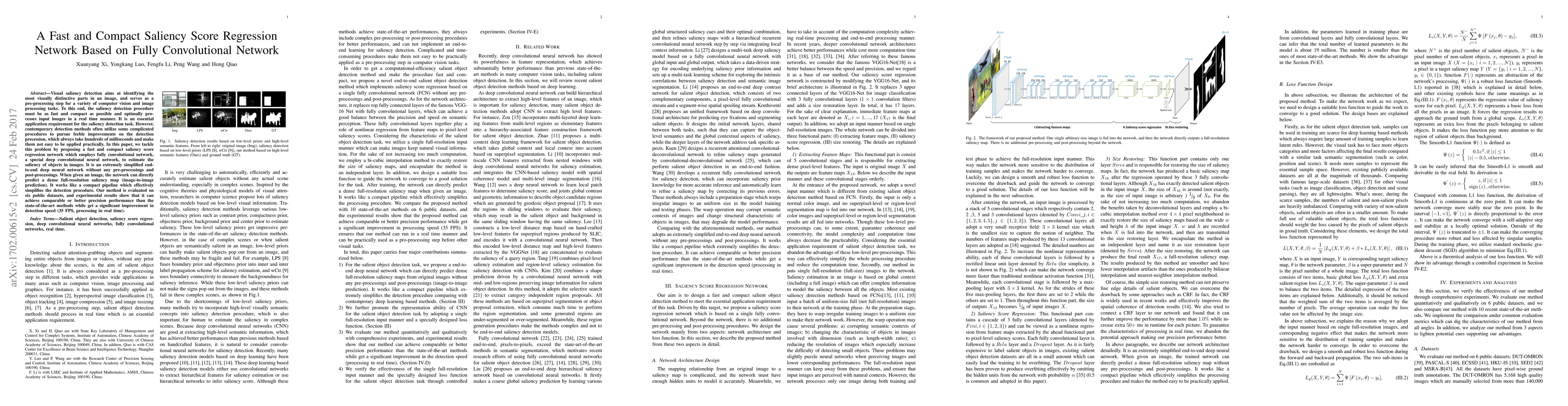 This paper proposes a fast and compact saliency score regression network based on a fully convolutional network to efficiently detect salient regions in images in real time. The method achieves comparable precision to state-of-the-art techniques while significantly improving detection speed to 35 FPS.
