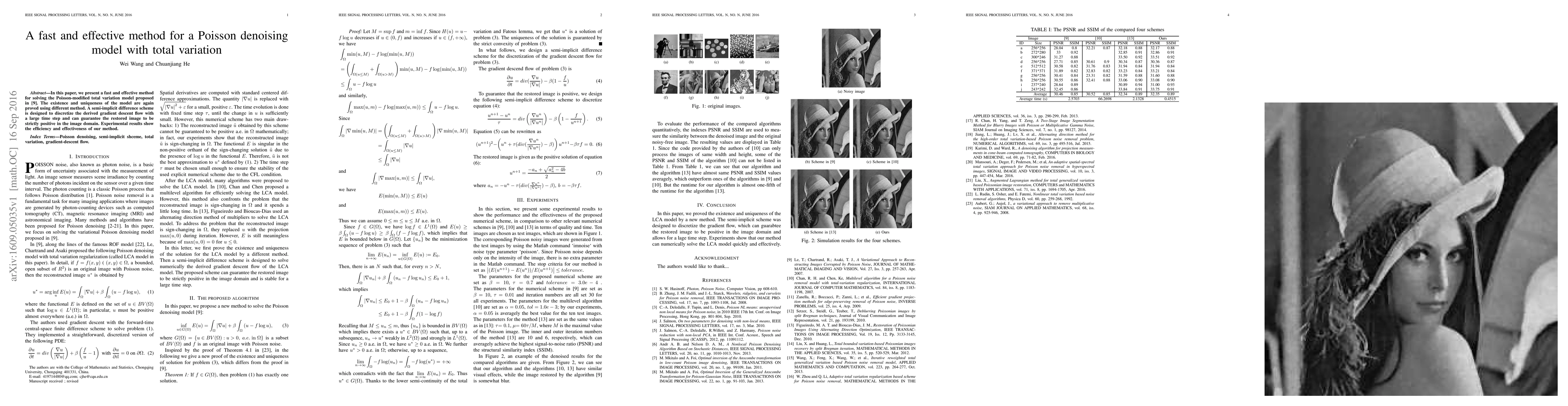 A fast method is presented for solving a Poisson-modified total variation model, ensuring strictly positive image values with large time steps, and demonstrating high efficiency and effectiveness in experimental results.