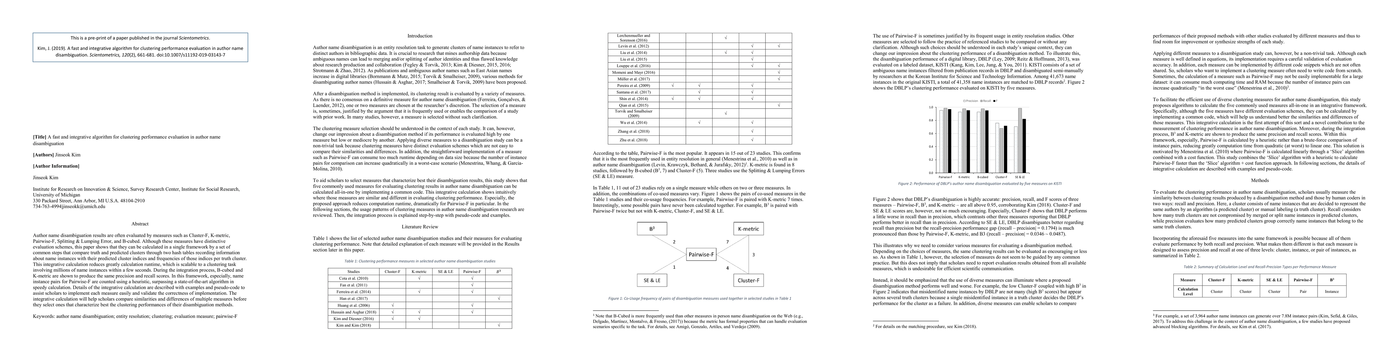 This paper presents an efficient algorithm that unifies the calculation of various author name disambiguation evaluation measures into a single framework, significantly reducing computation time. It also reveals that B-cubed and K-metric yield identical precision and recall scores within this framework, and introduces a heuristic for faster Pairwise-F computation.