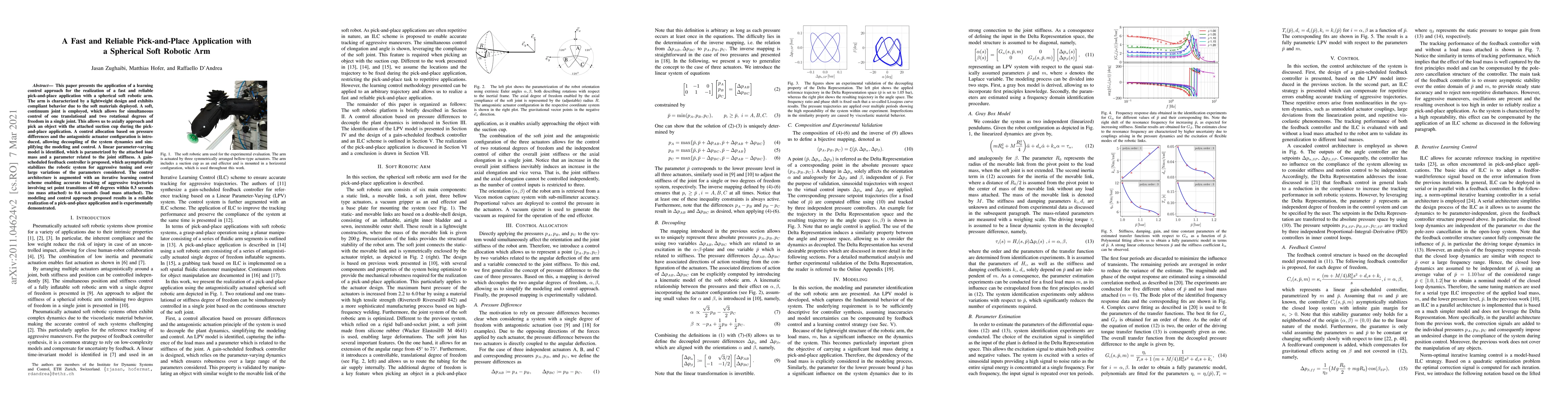 This paper presents the application of a learning control approach for the realization of a fast and reliable pick-and-place application with a spherical soft robotic arm. The arm is characterized by a lightweight design and exhibits compliant behavior due to the soft materials deployed. A soft, continuum joint is employed, which allows for simultaneous control of one translational and two rotational degrees of freedom in a single joint. This allows us to axially approach and pick an object with the attached suction cup during the pick-and-place application. A control allocation based on pressure differences and the antagonistic actuator configuration is introduced, allowing decoupling of the system dynamics and simplifying the modeling and control. A linear parameter-varying model is identified, which is parametrized by the attached load mass and a parameter related to the joint stiffness. A gain-scheduled feedback controller is proposed, which asymptotically stabilizes the robotic system for aggressive tuning and over large variations of the parameters considered. The control architecture is augmented with an iterative learning control scheme enabling accurate tracking of aggressive trajectories involving set point transitions of 60 degrees within 0.3 seconds (no mass attached) to 0.6 seconds (load mass attached). The modeling and control approach proposed results in a reliable realization of a pick-and-place application and is experimentally demonstrated.