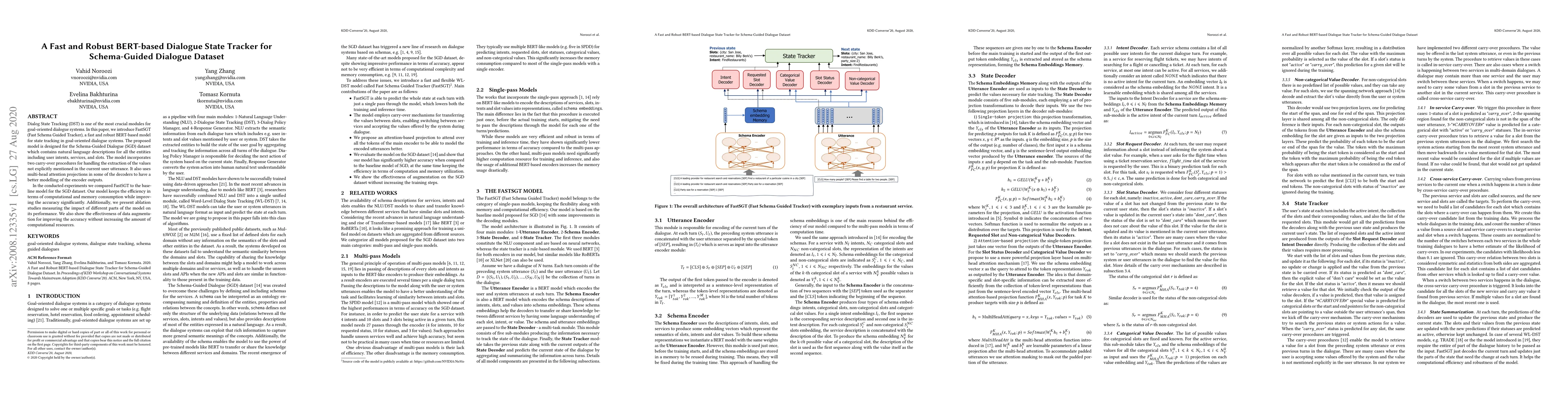 This paper presents FastSGT, a BERT-based dialogue state tracker for the Schema-Guided Dialogue dataset, which efficiently tracks user intents and slots while significantly improving accuracy over baseline models. The model employs two carry-over procedures and multi-head attention to enhance performance without increasing computational costs.
