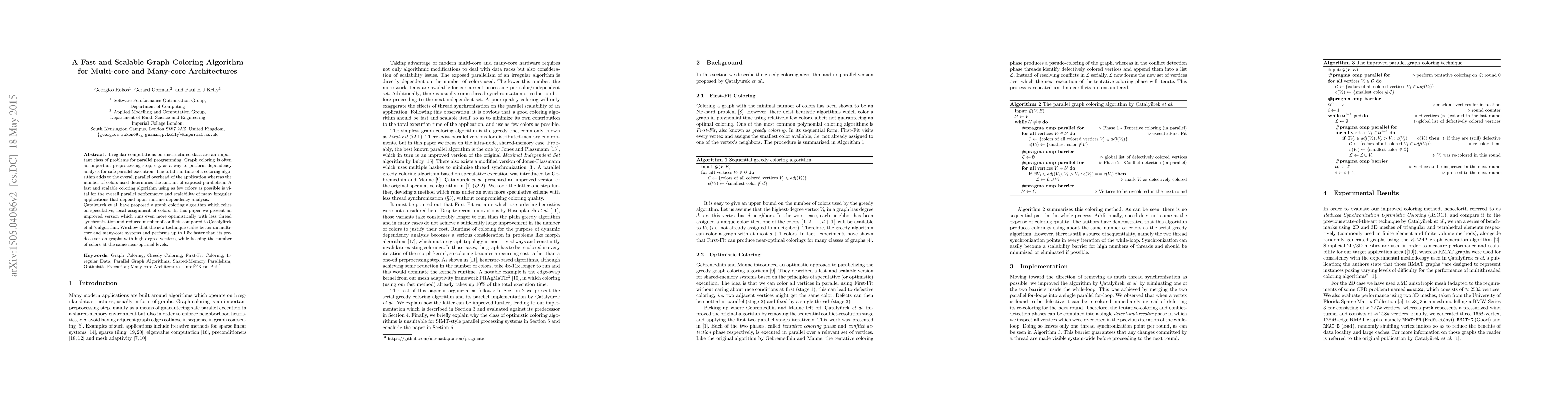 Irregular computations on unstructured data are an important class of problems for parallel programming. Graph coloring is often an important preprocessing step, e.g. as a way to perform dependency analysis for safe parallel execution. The total run time of a coloring algorithm adds to the overall parallel overhead of the application whereas the number of colors used determines the amount of exposed parallelism. A fast and scalable coloring algorithm using as few colors as possible is vital for the overall parallel performance and scalability of many irregular applications that depend upon runtime dependency analysis. Catalyurek et al. have proposed a graph coloring algorithm which relies on speculative, local assignment of colors. In this paper we present an improved version which runs even more optimistically with less thread synchronization and reduced number of conflicts compared to Catalyurek et al.'s algorithm. We show that the new technique scales better on multi-core and many-core systems and performs up to 1.5x faster than its predecessor on graphs with high-degree vertices, while keeping the number of colors at the same near-optimal levels.