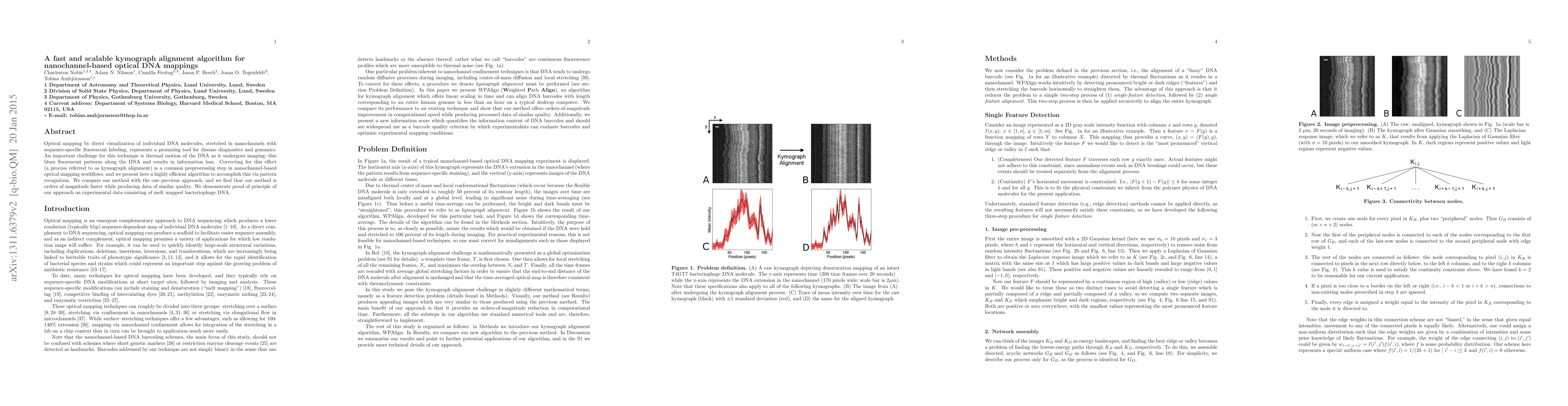 Optical mapping by direct visualization of individual DNA molecules, stretched in nanochannels with sequence-specific fluorescent labeling, represents a promising tool for disease diagnostics and genomics. An important challenge for this technique is thermal motion of the DNA as it undergoes imaging; this blurs fluorescent patterns along the DNA and results in information loss. Correcting for this effect (a process referred to as kymograph alignment) is a common preprocessing step in nanochannel-based optical mapping workflows, and we present here a highly efficient algorithm to accomplish this via pattern recognition. We compare our method with the one previous approach, and we find that our method is orders of magnitude faster while producing data of similar quality. We demonstrate proof of principle of our approach on experimental data consisting of melt mapped bacteriophage DNA.