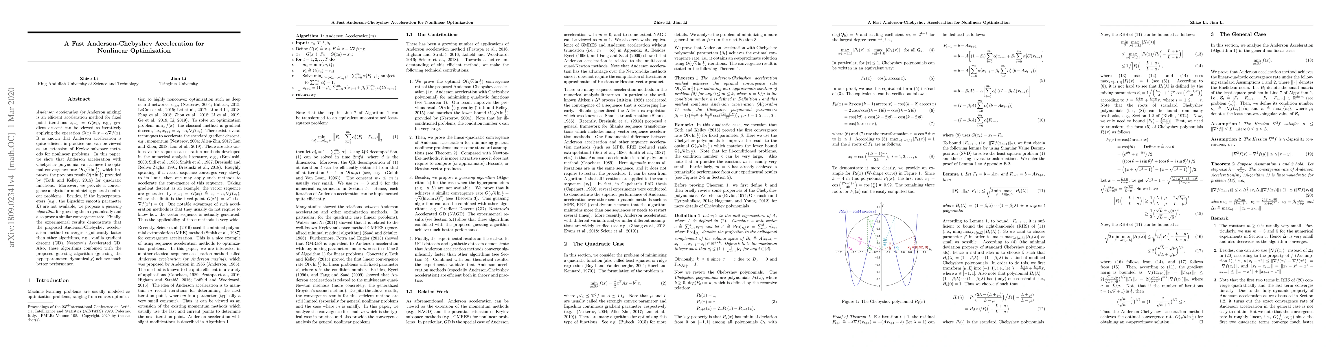 This paper proposes a fast Anderson-Chebyshev acceleration method for nonlinear optimization, achieving an optimal convergence rate of $O(\sqrt{\kappa}\ln\frac{1}{\epsilon})$, surpassing previous results. It also introduces a guessing algorithm for dynamically determining hyperparameters and demonstrates superior performance over other optimization methods in experiments.