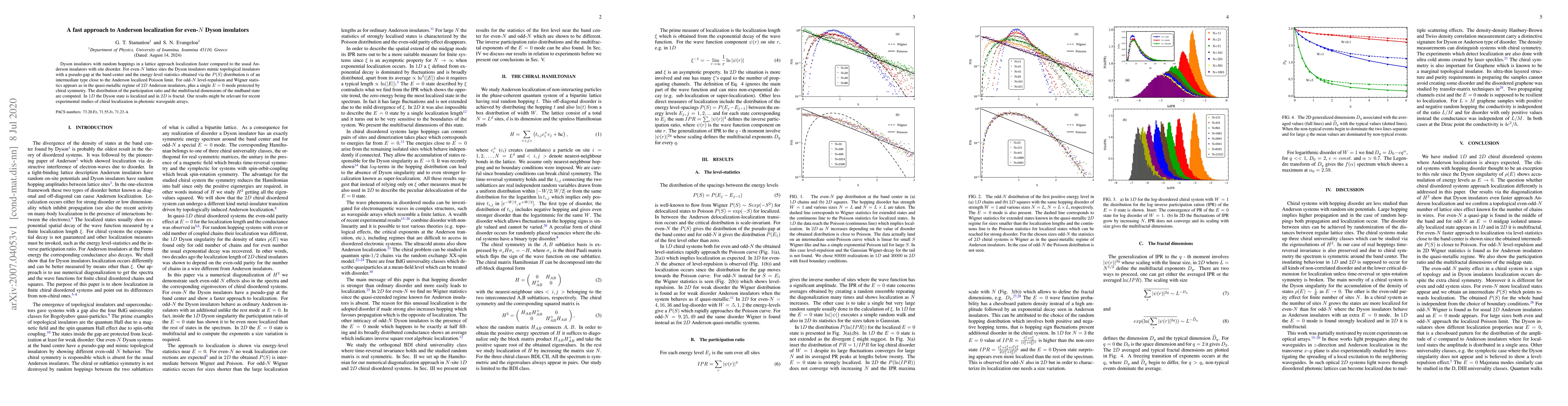 This paper explores the rapid localization in even-$N$ Dyson insulators compared to traditional Anderson insulators, revealing pseudo-gaps and intermediate energy-level statistics. It also discusses the fractal nature of the 2D Dyson state and its relevance to experimental studies of chiral localization in photonic systems.