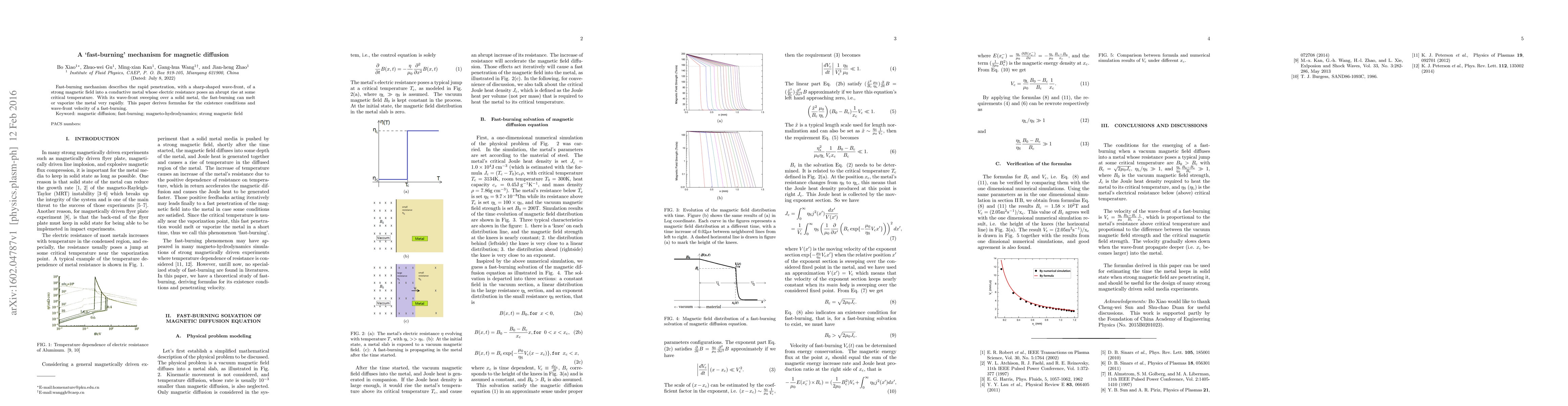 This paper explores a fast-burning mechanism for magnetic diffusion, detailing the rapid penetration of a strong magnetic field into conductive metals experiencing a sharp rise in electric resistance at critical temperatures. The study derives formulas for the conditions and velocity of the fast-burning wave-front, which can rapidly melt or vaporize the metal.