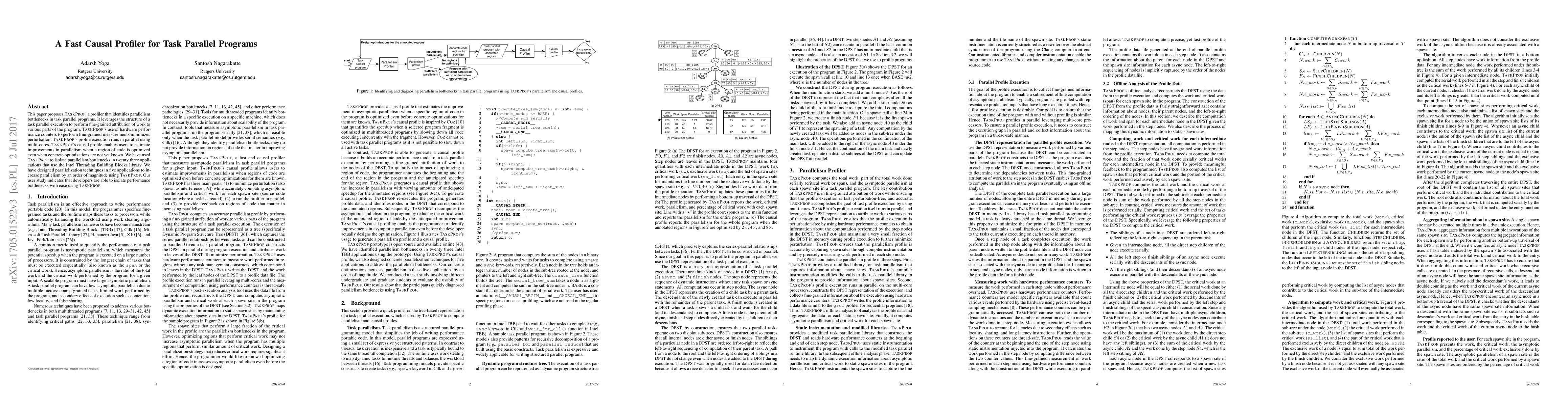 This paper proposes TASKPROF, a profiler that identifies parallelism bottlenecks in task parallel programs. It leverages the structure of a task parallel execution to perform fine-grained attribution of work to various parts of the program. TASKPROF's use of hardware performance counters to perform fine-grained measurements minimizes perturbation. TASKPROF's profile execution runs in parallel using multi-cores. TASKPROF's causal profile enables users to estimate improvements in parallelism when a region of code is optimized even when concrete optimizations are not yet known. We have used TASKPROF to isolate parallelism bottlenecks in twenty three applications that use the Intel Threading Building Blocks library. We have designed parallelization techniques in five applications to in- crease parallelism by an order of magnitude using TASKPROF. Our user study indicates that developers are able to isolate performance bottlenecks with ease using TASKPROF.