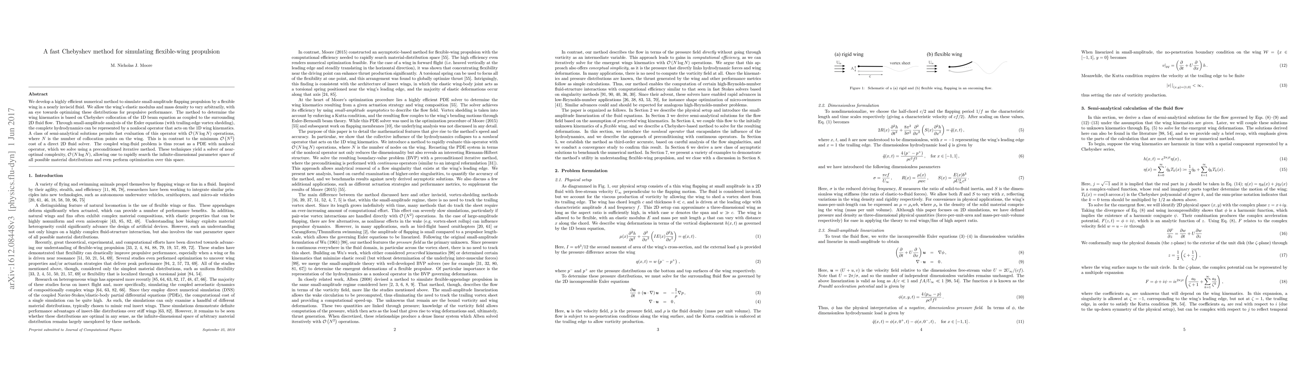 We develop a highly efficient numerical method to simulate small-amplitude flapping propulsion by a flexible wing in a nearly inviscid fluid. We allow the wing's elastic modulus and mass density to vary arbitrarily, with an eye towards optimizing these distributions for propulsive performance. The method to determine the wing kinematics is based on Chebyshev collocation of the 1D beam equation as coupled to the surrounding 2D fluid flow. Through small-amplitude analysis of the Euler equations (with trailing-edge vortex shedding), the complete hydrodynamics can be represented by a nonlocal operator that acts on the 1D wing kinematics. A class of semi-analytical solutions permits fast evaluation of this operator with $O(N \log N)$ operations, where $N$ is the number of collocation points on the wing. This is in contrast to the minimum $O(N^2)$ operations required by a direct 2D fluid solver. The coupled wing-fluid problem is thus recast as a PDE with nonlocal operator, which we solve using a preconditioned iterative method. These techniques yield a solver of near-optimal complexity, $O(N \log N)$, allowing one to rapidly search the infinite-dimensional parameter space of all possible material distributions and even perform optimization over this space.