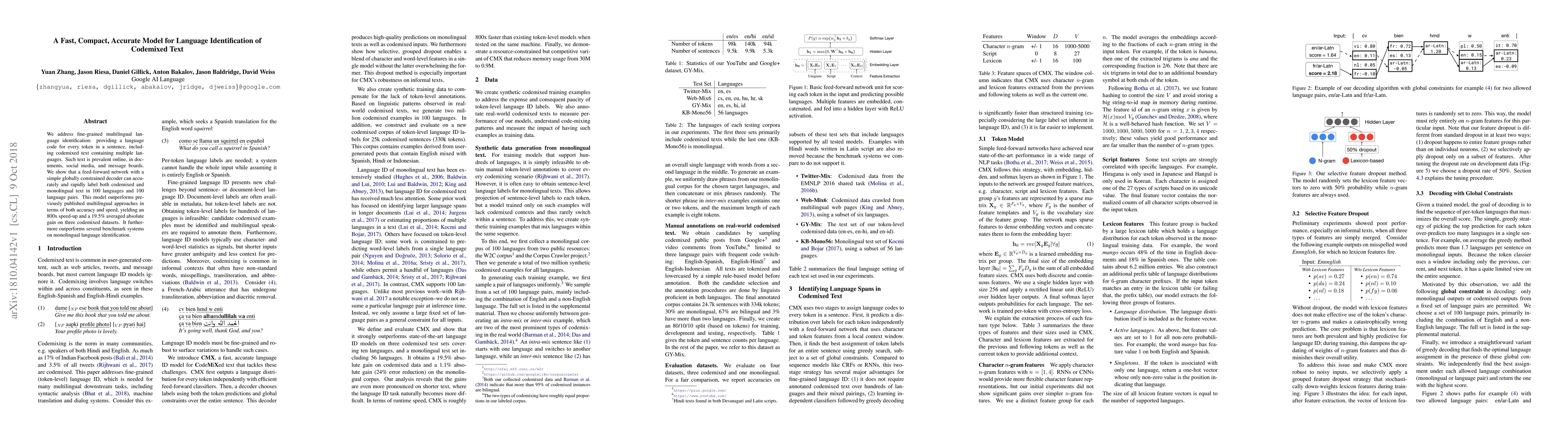 This research presents a fast, compact, and accurate feed-forward neural network model for fine-grained multilingual language identification, including codemixed text, outperforming previous methods in both speed and accuracy across 100 languages and language pairs. The model achieves an 800x speed-up and a 19.5% improvement on several datasets.
