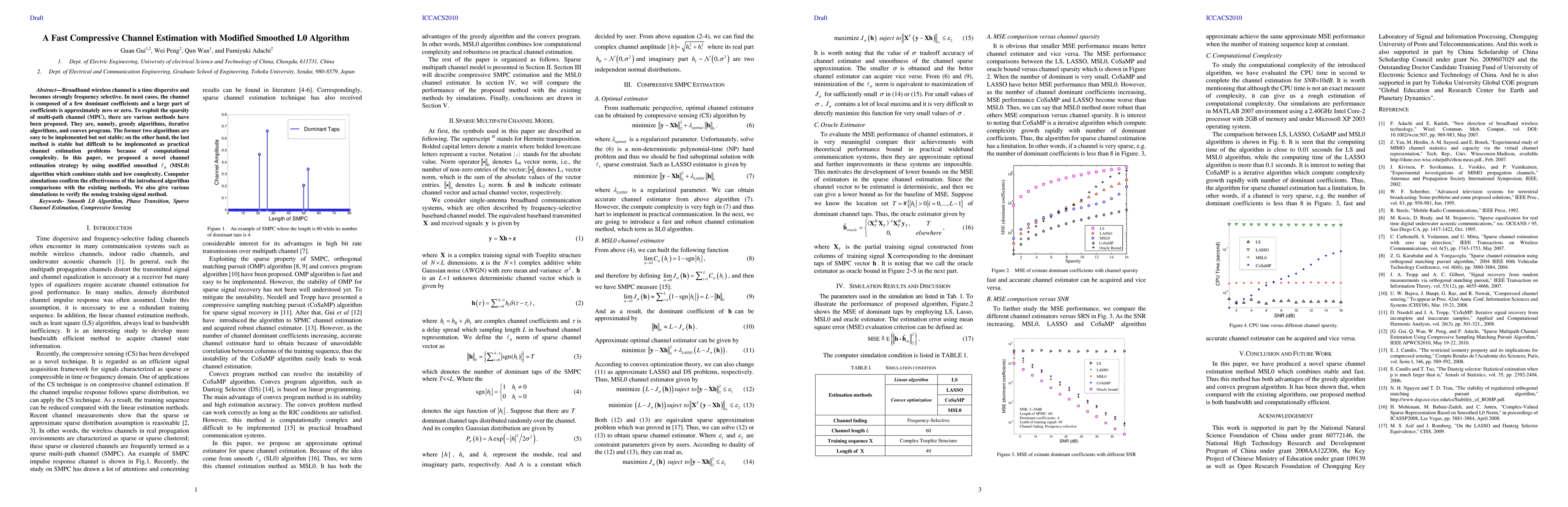 Broadband wireless channel is a time dispersive and becomes strongly frequency selective. In most cases, the channel is composed of a few dominant coefficients and a large part of coefficients is approximately zero or zero. To exploit the sparsity of multi-path channel (MPC), there are various methods have been proposed. They are, namely, greedy algorithms, iterative algorithms, and convex program. The former two algorithms are easy to be implemented but not stable; on the other hand, the last method is stable but difficult to be implemented as practical channel estimation problems because of computational complexity. In this paper, we proposed a novel channel estimation strategy by using modified smoothed (MSL0) algorithm which combines stable and low complexity. Computer simulations confirm the effectiveness of the introduced algorithm comparisons with the existing methods. We also give