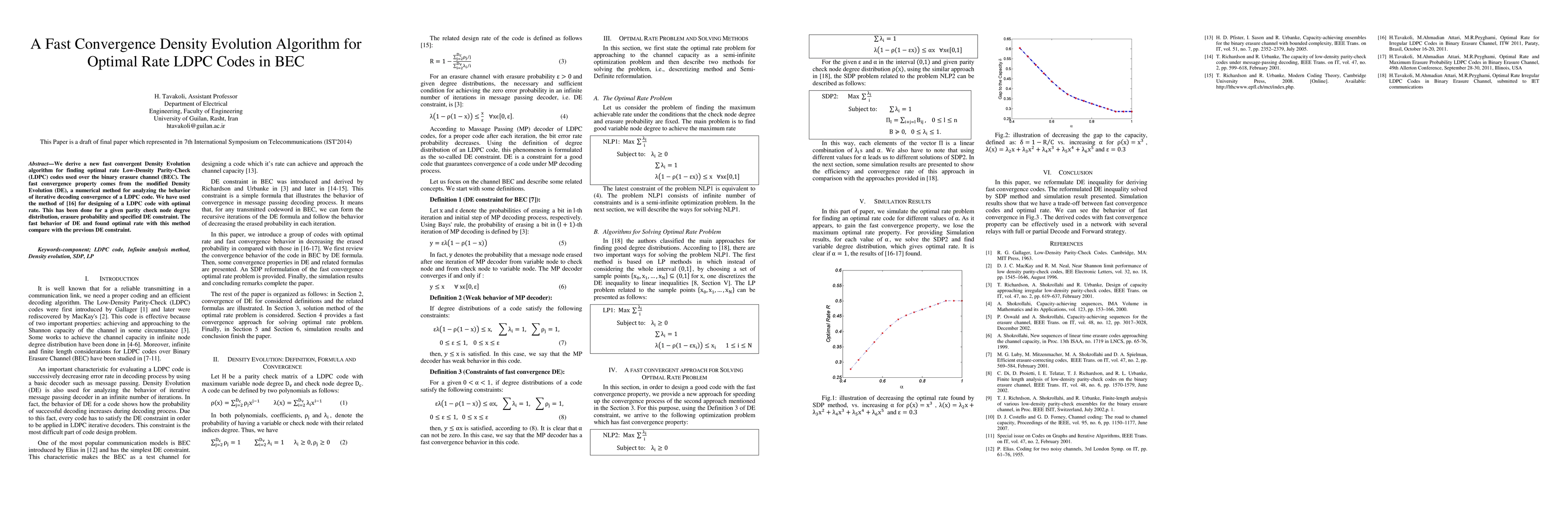 This research introduces a novel, fast-converging Density Evolution algorithm for creating optimal rate Low-Density Parity-Check (LDPC) codes over the binary erasure channel (BEC). The method, built upon [16], ensures rapid convergence and optimal rate determination under specified constraints, outperforming previous DE approaches.