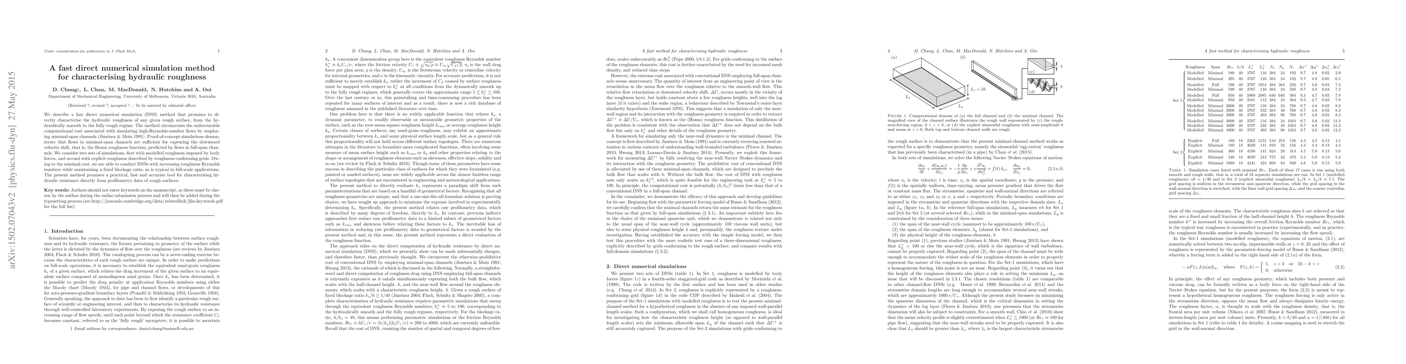 This paper presents a fast direct numerical simulation (DNS) method for characterizing hydraulic roughness in various flow regimes using minimal-span channels, demonstrating its effectiveness through proof-of-concept simulations. The method offers a practical, cost-efficient alternative to traditional high-Reynolds-number flow simulations.