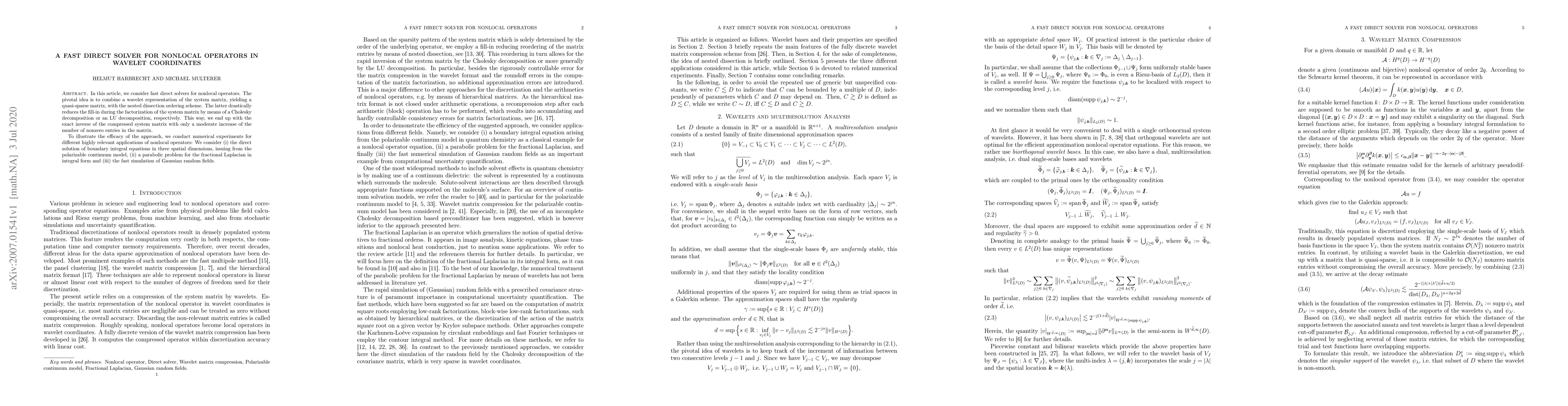 This paper proposes a fast direct solver for nonlocal operators by leveraging wavelet representation and nested dissection ordering to minimize fill-in during matrix factorization. Numerical experiments demonstrate its effectiveness in solving boundary integral equations, fractional Laplacian problems, and Gaussian random fields.