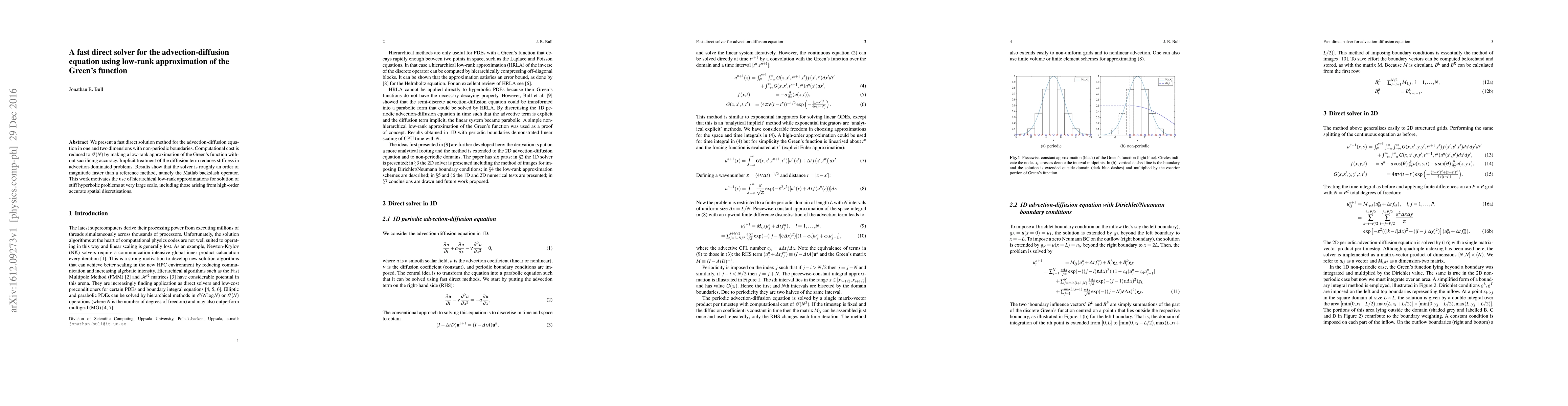 We present a fast direct solution method for the advection-diffusion equation in one and two dimensions with non-periodic boundaries. Computational cost is reduced to $\mathcal O(N)$ by making a low-rank approximation of the Green's function without sacrificing accuracy. Implicit treatment of the diffusion term reduces stiffness in advection-dominated problems. Results show that the solver is roughly an order of magnitude faster than a reference method, namely the Matlab backslash operator. This work motivates the use of hierarchical low-rank approximations for solution of stiff hyperbolic problems at very large scale, including those arising from high-order accurate spatial discretisations.