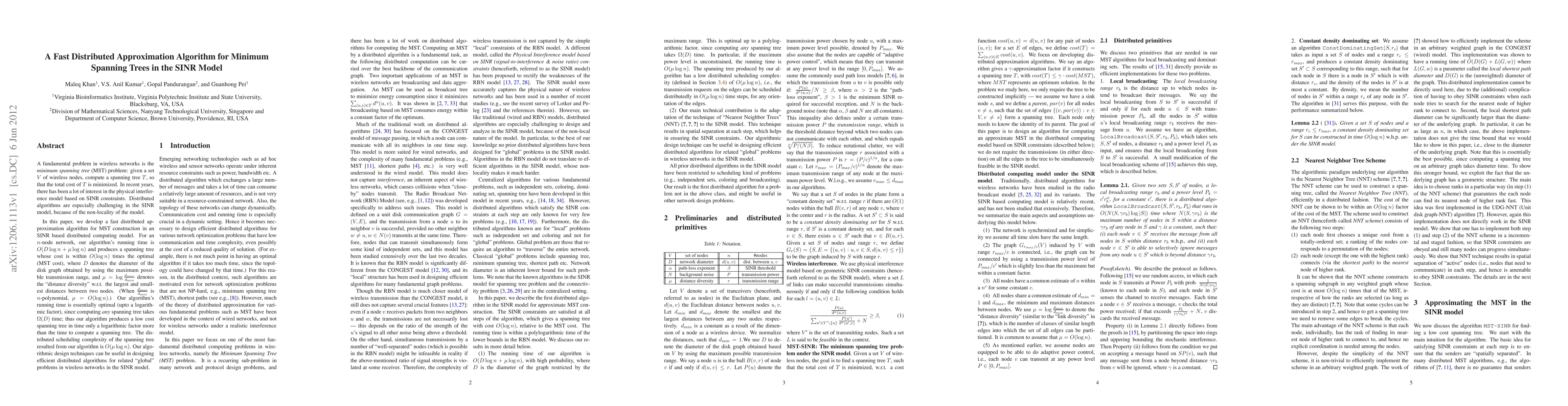 A fundamental problem in wireless networks is the \emph{minimum spanning tree} (MST) problem: given a set $V$ of wireless nodes, compute a spanning tree $T$, so that the total cost of $T$ is minimized. In recent years, there has been a lot of interest in the physical interference model based on SINR constraints. Distributed algorithms are especially challenging in the SINR model, because of the non-locality of the model. In this paper, we develop a fast distributed approximation algorithm for MST construction in an SINR based distributed computing model. For an $n$-node network, our algorithm's running time is $O(D\log{n}+\mu\log{n})$ and produces a spanning tree whose cost is within $O(\log n)$ times the optimal (MST cost), where $D$ denotes the diameter of the disk graph obtained by using the maximum possible transmission range, and $\mu=\log{\frac{d_{max}}{d_{min}}}$ denotes the "distance diversity" w.r.t. the largest and smallest distances between two nodes. (When $\frac{d_{max}}{d_{min}}$ is $n$-polynomial, $\mu = O(\log n)$.) Our algorithm's running time is essentially optimal (upto a logarithmic factor), since computing {\em any} spanning tree takes $\Omega(D)$ time; thus our algorithm produces a low cost spanning tree in time only a logarithmic factor more than the time to compute a spanning tree. The distributed scheduling complexity of the spanning tree resulted from our algorithm is $O(\mu \log n)$. Our algorithmic design techniques can be useful in designing efficient distributed algorithms for related "global" problems in wireless networks in the SINR model.