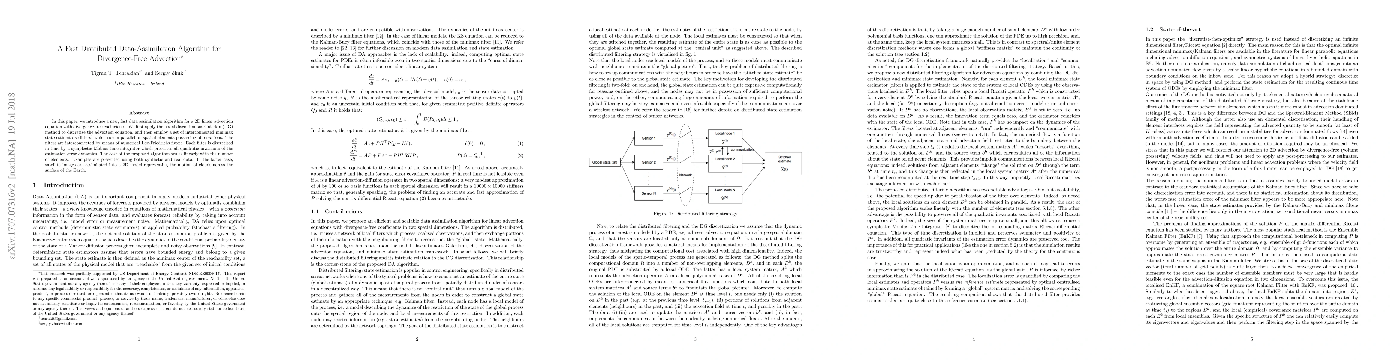 In this paper, we introduce a new, fast data assimilation algorithm for a 2D linear advection equation with divergence-free coefficients. We first apply the nodal discontinuous Galerkin (DG) method to discretize the advection equation, and then employ a set of interconnected minimax state estimators (filters) which run in parallel on spatial elements possessing observations. The filters are interconnected by means of numerical Lax-Friedrichs fluxes. Each filter is discretised in time by a symplectic Mobius time integrator which preserves all quadratic invariants of the estimation error dynamics. The cost of the proposed algorithm scales linearly with the number of elements. Examples are presented using both synthetic and real data. In the latter case, satellite images are assimilated into a 2D model representing the motion of clouds across the surface of the Earth.