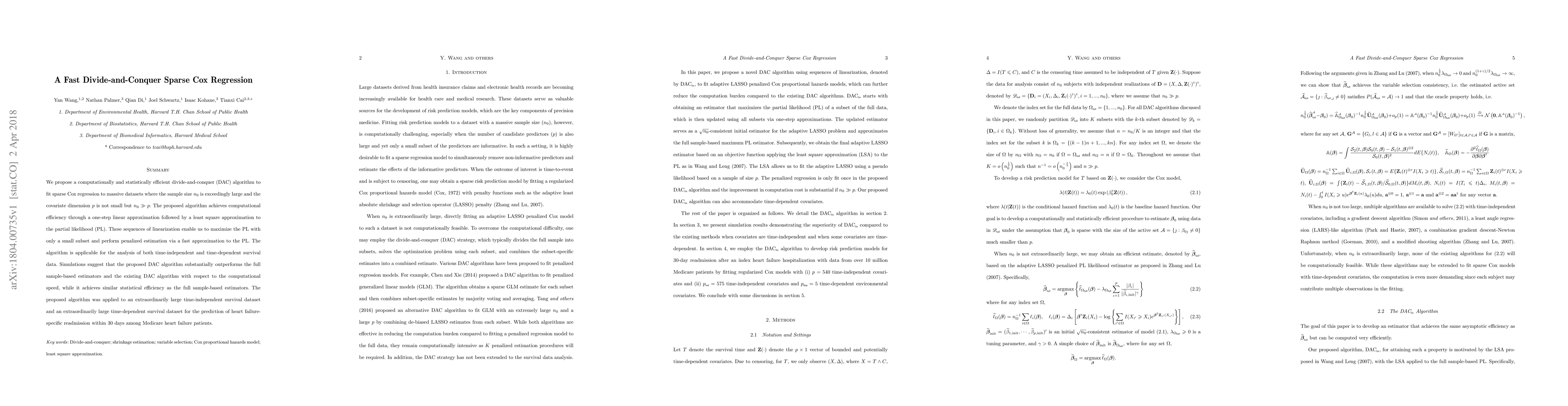 This paper introduces a fast divide-and-conquer algorithm for sparse Cox regression suitable for large datasets with many covariates. The proposed method significantly improves computational efficiency while maintaining statistical accuracy compared to existing methods.