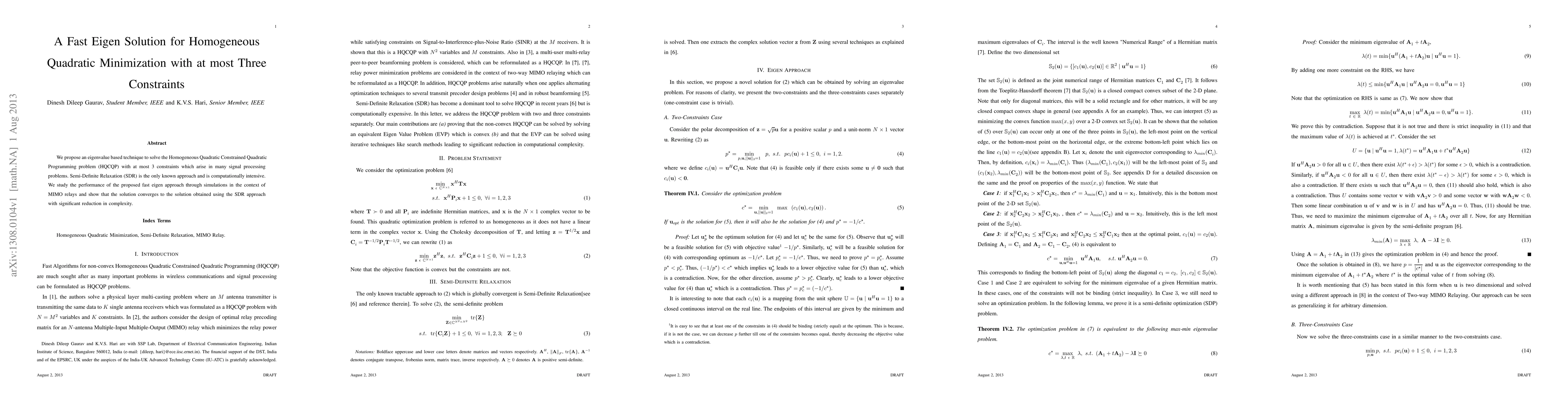We propose an eigenvalue based technique to solve the Homogeneous Quadratic Constrained Quadratic Programming problem (HQCQP) with at most 3 constraints which arise in many signal processing problems. Semi-Definite Relaxation (SDR) is the only known approach and is computationally intensive. We study the performance of the proposed fast eigen approach through simulations in the context of MIMO relays and show that the solution converges to the solution obtained using the SDR approach with significant reduction in complexity.