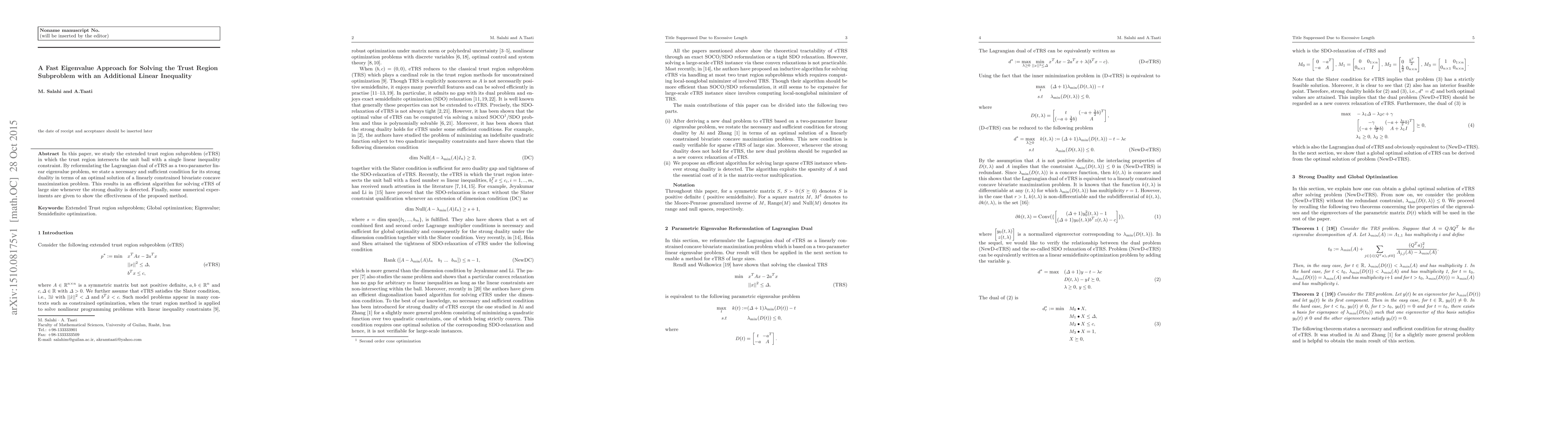In this paper, we study the extended trust region subproblem (eTRS) in which the trust region intersects the unit ball with a single linear inequality constraint. By reformulating the Lagrangian dual of eTRS as a two-parameter linear eigenvalue problem, we state a necessary and sufficient condition for its strong duality in terms of an optimal solution of a linearly constrained bivariate concave maximization problem. This results in an efficient algorithm for solving eTRS of large size whenever the strong duality is detected. Finally, some numerical experiments are given to show the effectiveness of the proposed method.
