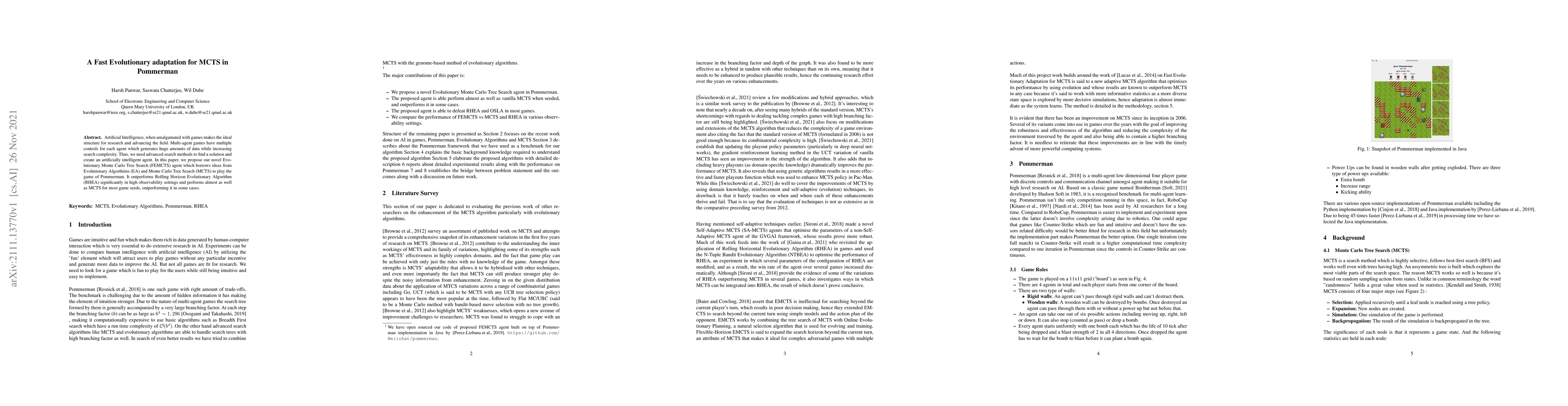 A novel algorithm, FEMCTS, combines evolutionary algorithms and Monte Carlo Tree Search to outperform traditional MCTS in the game of Pommerman, achieving significant improvements over a related method in high observability settings.
