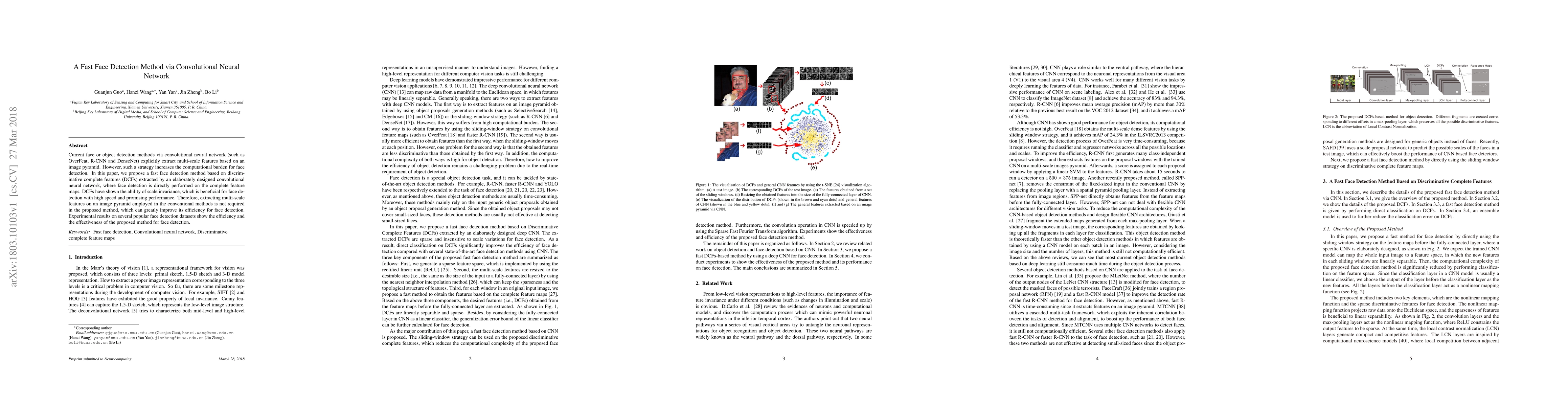 This paper proposes a fast face detection method using a convolutional neural network that extracts discriminative complete features (DCFs) directly from full feature maps, eliminating the need for multi-scale feature extraction on an image pyramid. The method demonstrates high speed and promising performance, significantly improving efficiency compared to conventional methods.