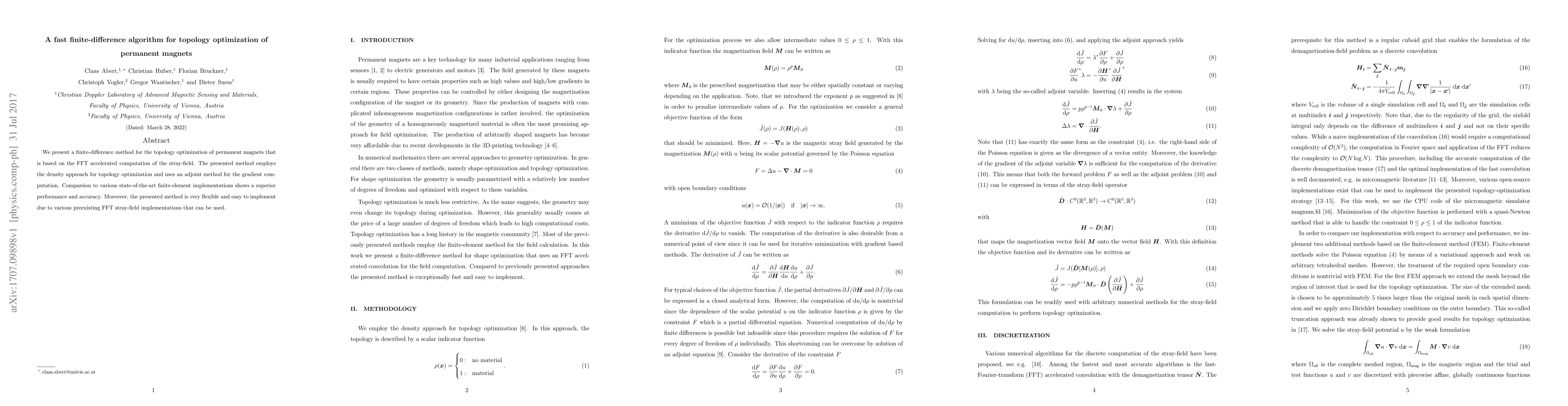 This paper introduces a fast finite-difference algorithm for optimizing the topology of permanent magnets using FFT-accelerated stray-field computation and the density approach. The method demonstrates superior performance and accuracy compared to finite-element methods, and is easy to implement due to existing FFT stray-field implementations.