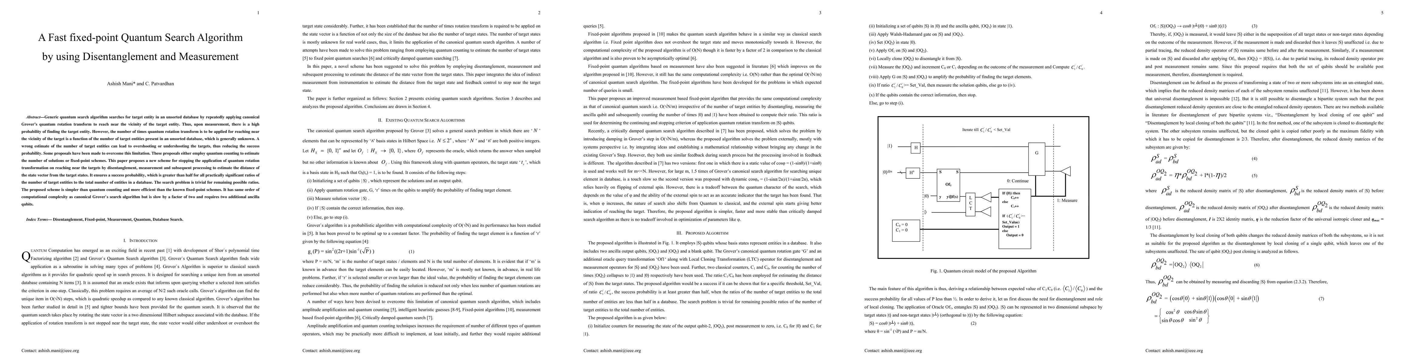 This paper proposes a fast fixed-point quantum search algorithm that uses disentanglement and measurement to determine when to stop applying Grover's rotation, ensuring a high success probability without requiring quantum counting. It is simpler and more efficient than existing fixed-point schemes, albeit slightly slower and requiring additional qubits.