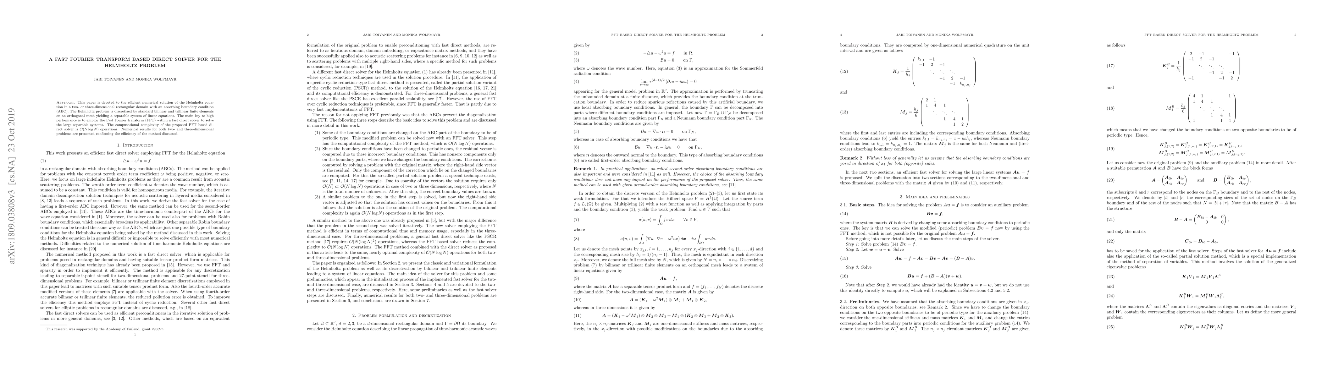 This paper presents an efficient FFT-based direct solver for solving the Helmholtz equation in rectangular domains, achieving O(N log N) complexity. The method leverages separable systems from finite element discretization and demonstrates high performance through numerical results in two and three dimensions.