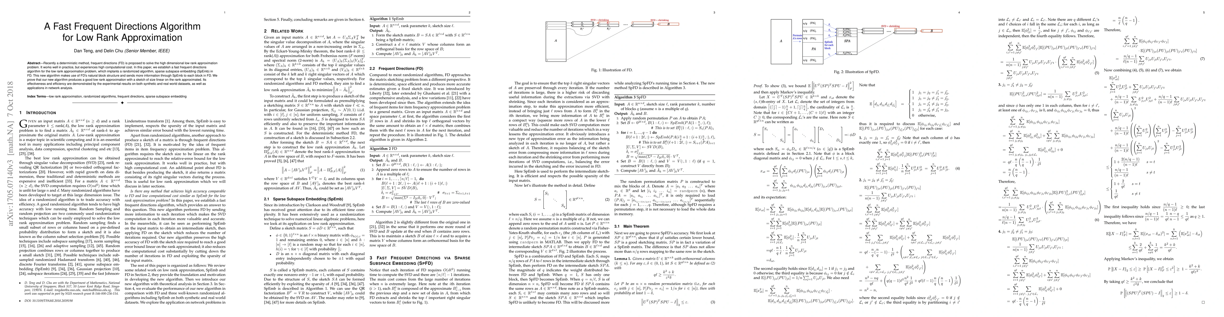 Recently a deterministic method, frequent directions (FD) is proposed to solve the high dimensional low rank approximation problem. It works well in practice, but experiences high computational cost. In this paper, we establish a fast frequent directions algorithm for the low rank approximation problem, which implants a randomized algorithm, sparse subspace embedding (SpEmb) in FD. This new algorithm makes use of FD's natural block structure and sends more information through SpEmb to each block in FD. We prove that our new algorithm produces a good low rank approximation with a sketch of size linear on the rank approximated. Its effectiveness and efficiency are demonstrated by the experimental results on both synthetic and real world datasets, as well as applications in network analysis.