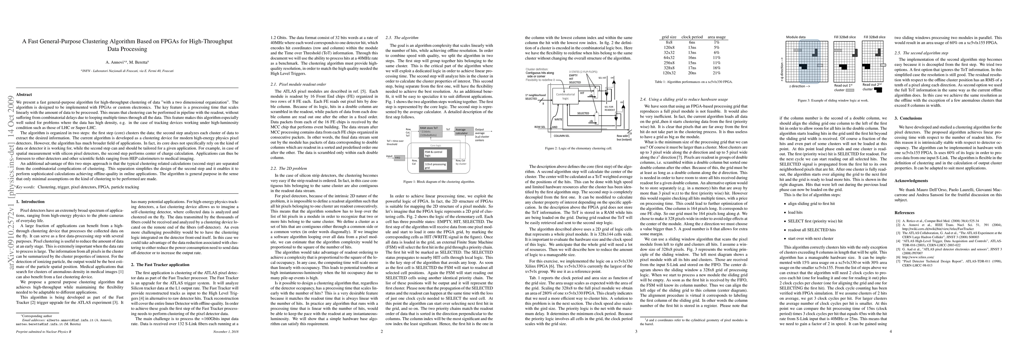 This paper introduces a fast, FPGA-based clustering algorithm for high-throughput data processing with linear scaling processing time. It features two steps: an initial clustering core followed by a tailored analysis step, making it versatile for applications in high-density data scenarios, such as high-energy physics detectors and medical imaging.