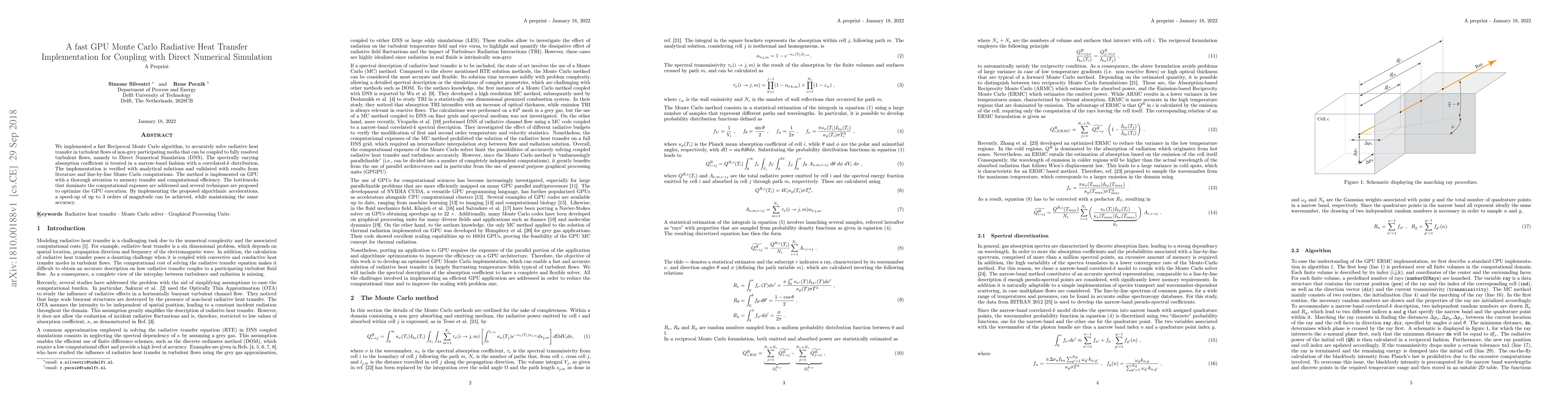 This paper presents a fast GPU-based Reciprocal Monte Carlo algorithm for solving radiative heat transfer in turbulent flows, optimized for coupling with Direct Numerical Simulation. The method achieves significant speed-ups of up to three orders of magnitude through algorithmic optimizations, maintaining accuracy and efficiency.