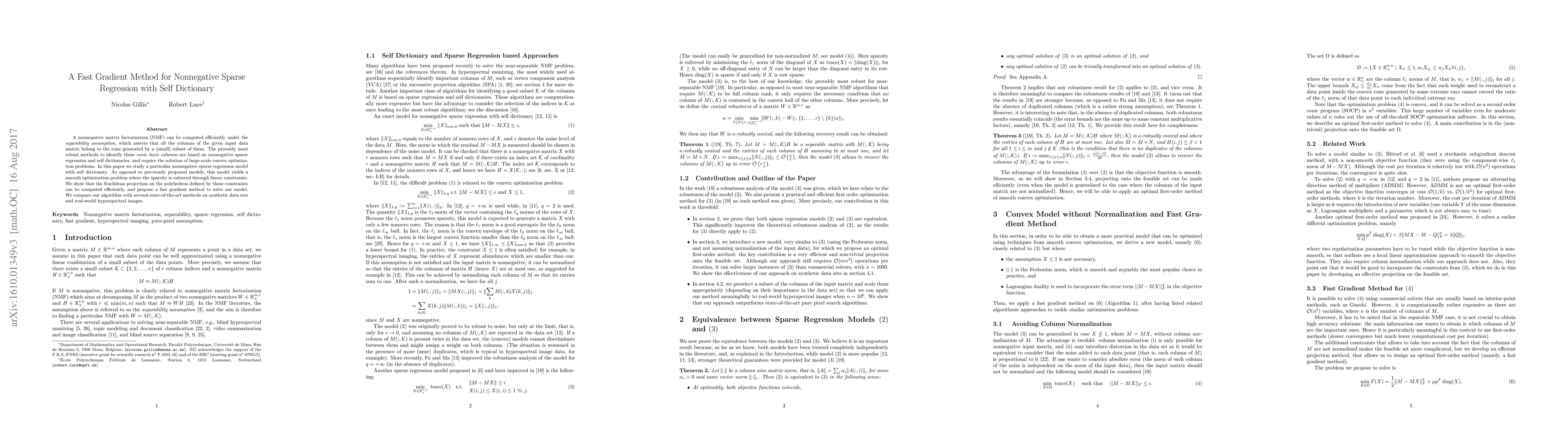 A nonnegative matrix factorization (NMF) can be computed efficiently under the separability assumption, which asserts that all the columns of the given input data matrix belong to the cone generated by a (small) subset of them. The provably most robust methods to identify these conic basis columns are based on nonnegative sparse regression and self dictionaries, and require the solution of large-scale convex optimization problems. In this paper we study a particular nonnegative sparse regression model with self dictionary. As opposed to previously proposed models, this model yields a smooth optimization problem where the sparsity is enforced through linear constraints. We show that the Euclidean projection on the polyhedron defined by these constraints can be computed efficiently, and propose a fast gradient method to solve our model. We compare our algorithm with several state-of-the-art methods on synthetic data sets and real-world hyperspectral images.