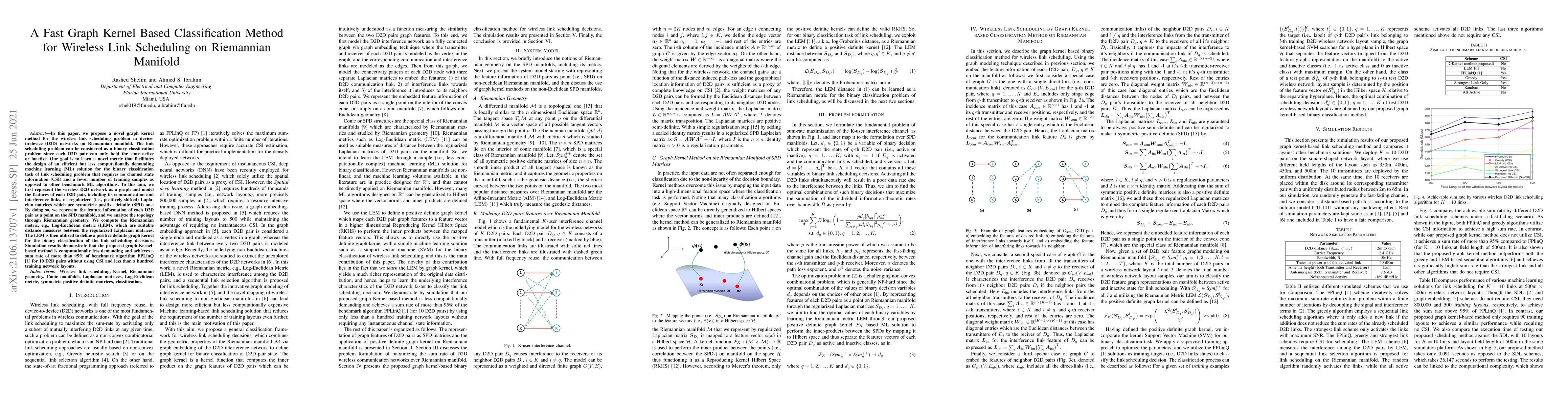 This paper introduces a novel graph kernel method for wireless link scheduling in D2D networks on Riemannian manifolds, aiming for efficient binary classification without channel state information. The method uses regularized Laplacian matrices on the SPD manifold and Log-Euclidean metric to define a graph kernel, achieving high sum rate performance with fewer training samples compared to benchmark algorithms.