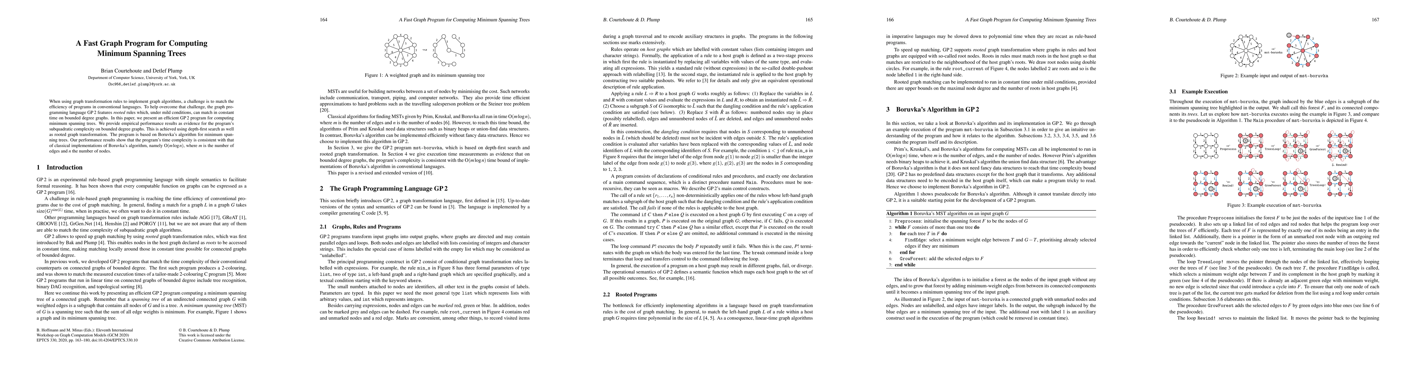 This paper presents an efficient GP 2 program for computing minimum spanning trees using Boruvka's algorithm, achieving subquadratic complexity on bounded degree graphs. Empirical results show the program's time complexity aligns with classical implementations, specifically O(m log n).