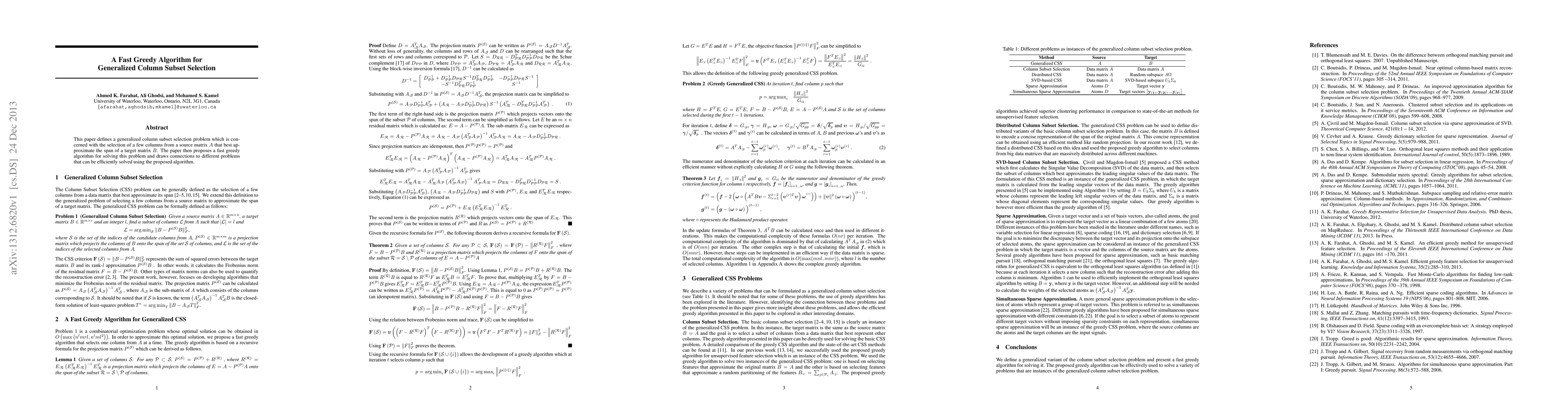 This paper introduces a generalized column subset selection problem and proposes a fast greedy algorithm to solve it, demonstrating its applicability to various related problems. The algorithm efficiently selects columns from matrix A that best approximate the span of matrix B.