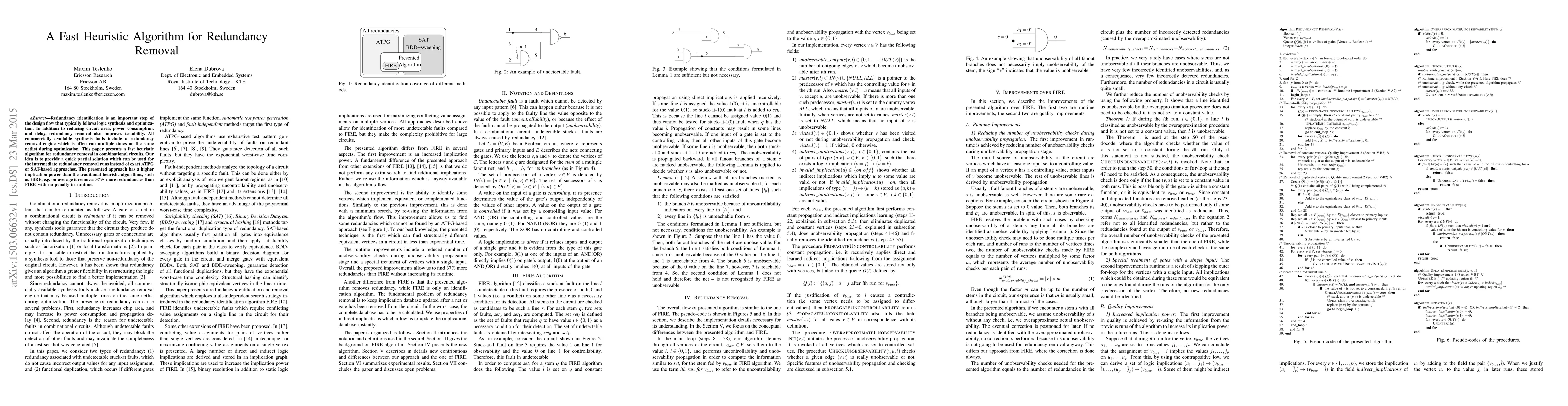 A fast heuristic algorithm for redundancy removal in combinational circuits improves testability while reducing circuit area, power consumption, and delay by 37% compared to traditional methods.