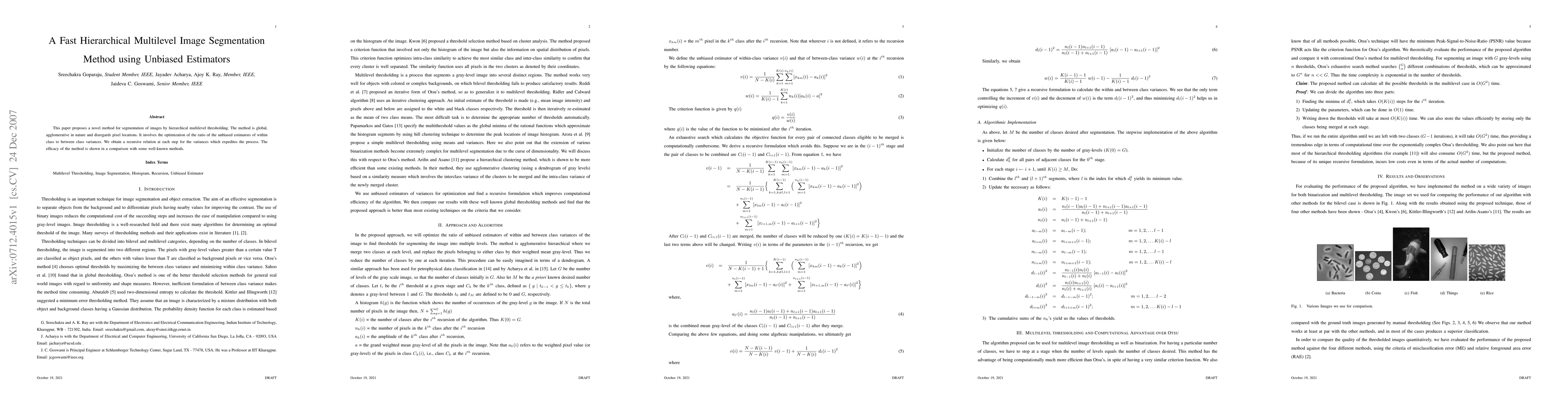 This paper proposes a novel method for segmentation of images by hierarchical multilevel thresholding. The method is global, agglomerative in nature and disregards pixel locations. It involves the optimization of the ratio of the unbiased estimators of within class to between class variances. We obtain a recursive relation at each step for the variances which expedites the process. The efficacy of the method is shown in a comparison with some well-known methods.