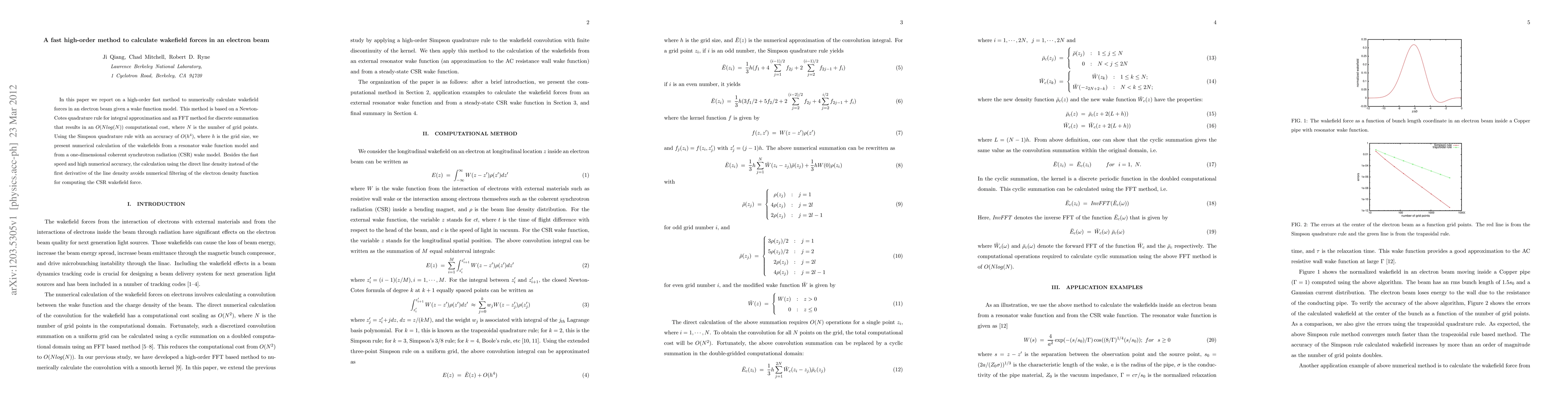 In this paper we report on a high-order fast method to numerically calculate wakefield forces in an electron beam given a wake function model. This method is based on a Newton-Cotes quadrature rule for integral approximation and an FFT method for discrete summation that results in an $O(Nlog(N))$ computational cost, where $N$ is the number of grid points. Using the Simpson quadrature rule with an accuracy of $O(h^4)$, where $h$ is the grid size, we present numerical calculation of the wakefields from a resonator wake function model and from a one-dimensional coherent synchrotron radiation (CSR) wake model. Besides the fast speed and high numerical accuracy, the calculation using the direct line density instead of the first derivative of the line density avoids numerical filtering of the electron density function for computing the CSR wakefield force.