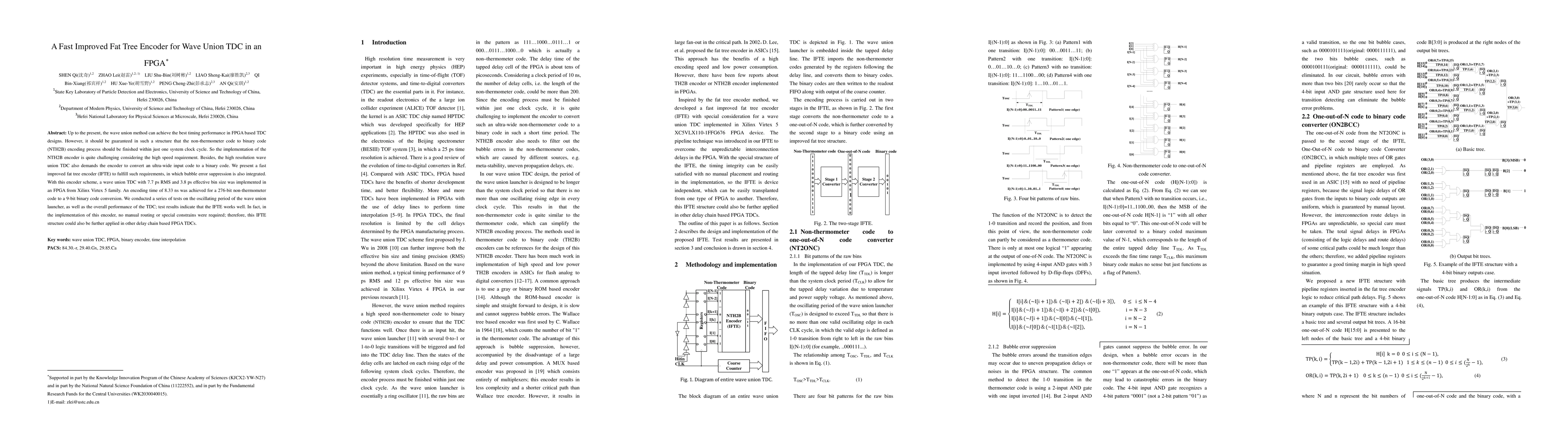 Up to the present, the wave union method can achieve the best timing performance in FPGA based TDC designs. However, it should be guaranteed in such a structure that the non-thermometer code to binary code (NTH2B) encoding process should be finished within just one system clock cycle. So the implementation of the NTH2B encoder is quite challenging considering the high speed requirement. Besides, the high resolution wave union TDC also demands the encoder to convert an ultra-wide input code to a binary code. We present a fast improved fat tree encoder (IFTE) to fulfill such requirements, in which bubble error suppression is also integrated. With this encoder scheme, a wave union TDC with 7.7 ps RMS and 3.8 ps effective bin size was implemented in an FPGA from Xilinx Virtex 5 family. An encoding time of 8.33 ns was achieved for a 276-bit non-thermometer code to a 9-bit binary code conversion. We conducted a series of tests on the oscillating period of the wave union launcher, as well as the overall performance of the TDC; test results indicate that the IFTE works well. In fact, in the implementation of this encoder, no manual routing or special constrains were required; therefore, this IFTE structure could also be further applied in other delay chain based FPGA TDCs.