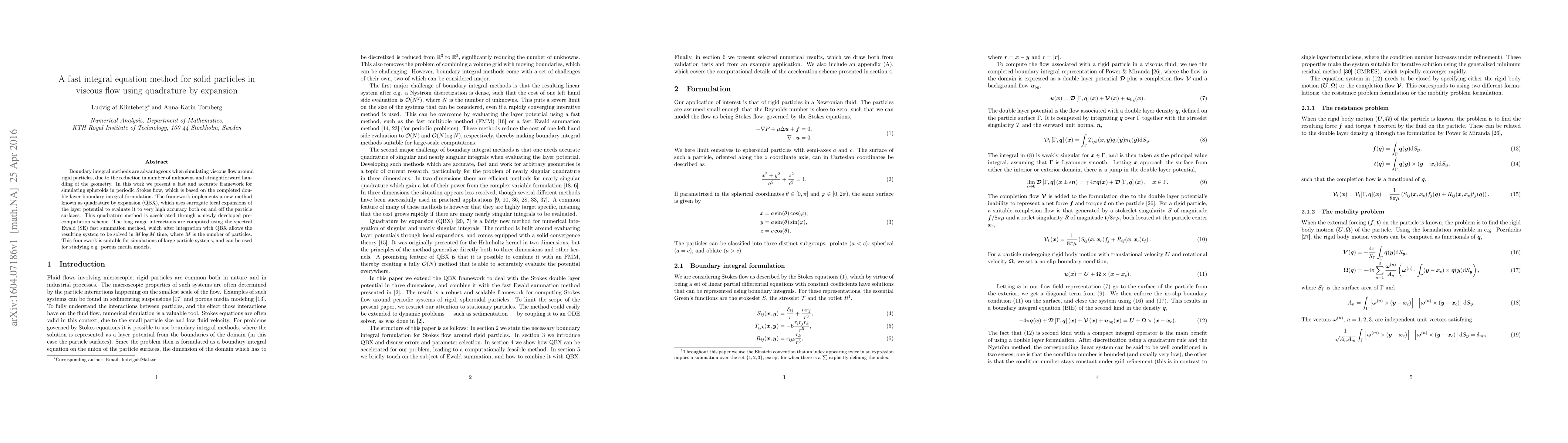 This paper presents a fast integral equation method for simulating viscous flow around solid particles using quadrature by expansion (QBX). The method employs a completed double layer boundary integral formulation and a precomputation scheme to achieve high accuracy and computational efficiency, enabling M log M time complexity for large particle systems.