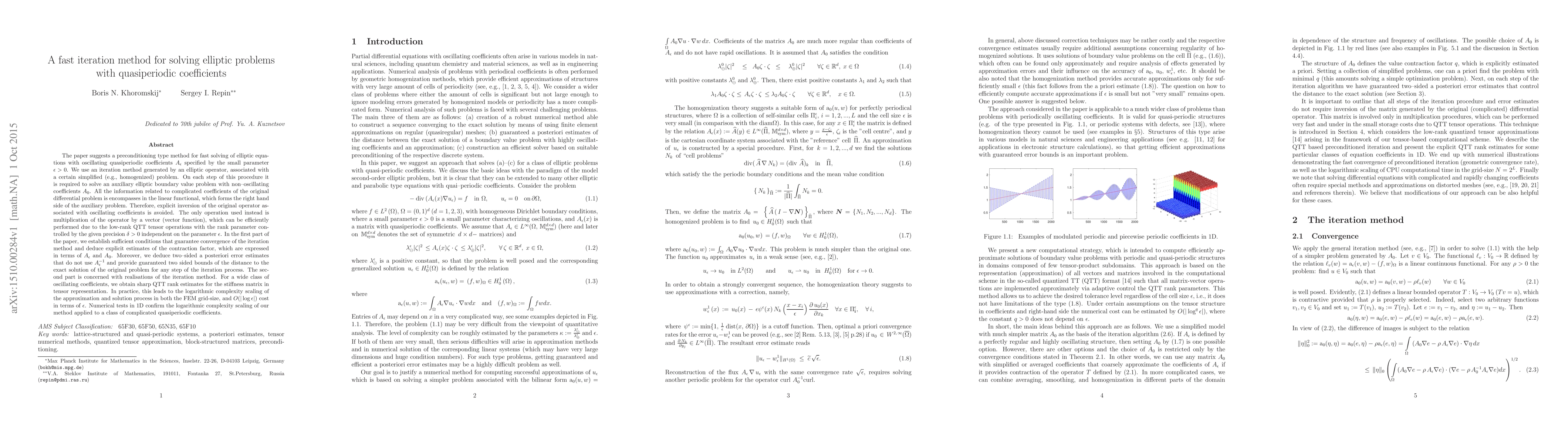 The paper suggests a preconditioning type method for fast solving of elliptic equations with oscillating quasiperiodic coefficients $A_\epsilon$ specified by the small parameter $\epsilon>0$. We use an iteration method generated by an elliptic operator, associated with a certain simplified (e.g., homogenized) problem. On each step of this procedure it is required to solve an auxiliary elliptic boundary value problem with non--oscillating coefficients $A_0$. All the information related to complicated coefficients of the original differential problem is encompasses in the linear functional, which forms the right hand side of the auxiliary problem. Therefore, explicit inversion of the original operator associated with oscillating coefficients is avoided. The only operation used instead is multiplication of the operator by a vector (vector function), which can be efficiently performed due to the low-rank QTT tensor operations with the rank parameter controlled by the given precision $\delta >0$ independent on the parameter $\epsilon$. We deduce two--sided a posteriori error estimates that do not use $A^{-1}_\epsilon$ and provide guaranteed two sided bounds of the distance to the exact solution of the original problem for any step of the iteration process. The second part is concerned with realisations of the iteration method. For a wide class of oscillating coefficients, we obtain sharp QTT rank estimates for the stiffness matrix in tensor representation. In practice, this leads to the logarithmic complexity scaling of the approximation and solution process in both the FEM grid-size, and $O(\vert\log\epsilon\vert)$ cost in terms of $\epsilon$. Numerical tests in 1D confirm the logarithmic complexity scaling of our method applied to a class of complicated quasiperiodic coefficients.