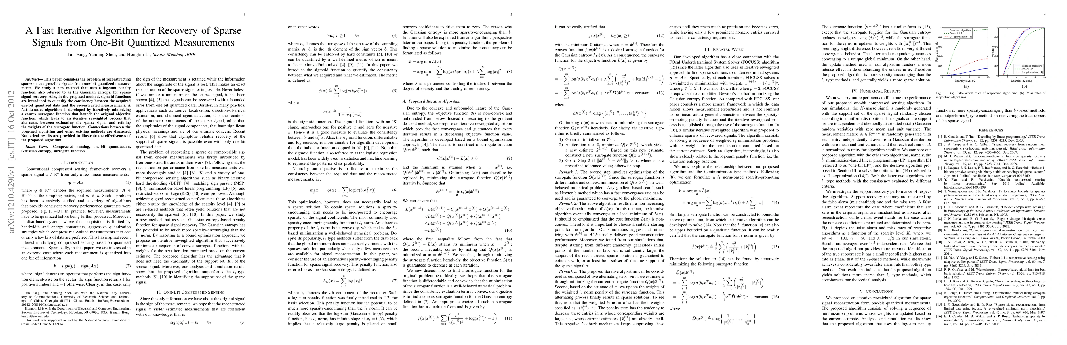 This paper proposes a fast iterative algorithm for reconstructing sparse signals from one-bit quantized measurements using a log-sum penalty function and sigmoid functions for consistency quantification. The algorithm iteratively minimizes a convex surrogate function, alternating between sparse signal estimation and weight refinement.