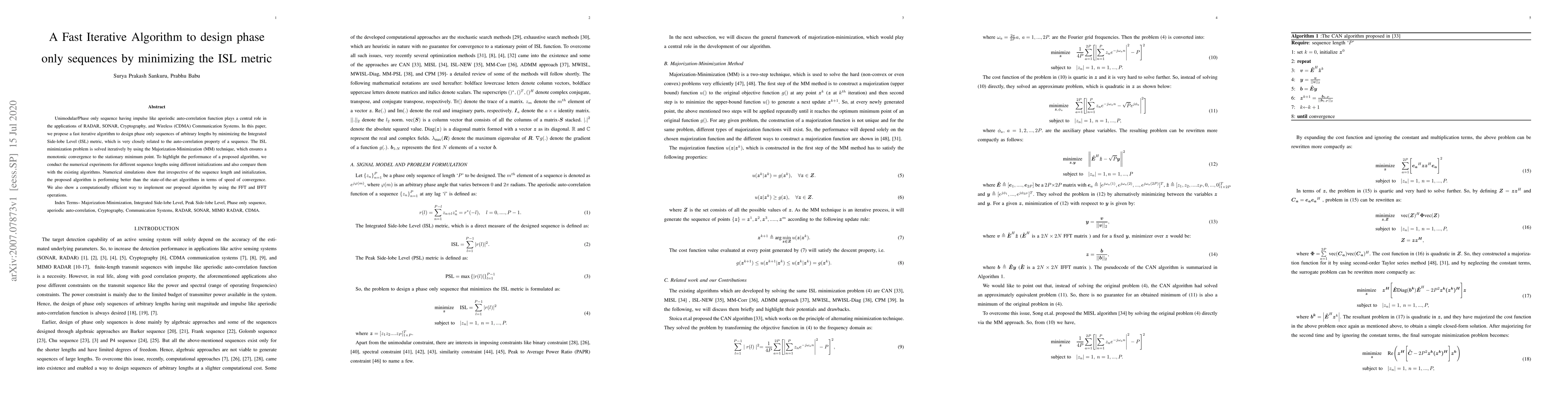 Unimodular/Phase only sequence having impulse like aperiodic auto-correlation function plays a central role in the applications of RADAR, SONAR, Cryptography, and Wireless (CDMA) Communication Systems. In this paper, we propose a fast iterative algorithm to design phase only sequences of arbitrary lengths by minimizing the Integrated Side-lobe Level (ISL) metric, which is very closely related to the auto-correlation property of a sequence. The ISL minimization problem is solved iteratively by using the Majorization-Minimization (MM) technique, which ensures a monotonic convergence to the stationary minimum point. To highlight the performance of a proposed algorithm, we conduct the numerical experiments for different sequence lengths using different initializations and also compare them with the existing algorithms. Numerical simulations show that irrespective of the sequence length and initialization, the proposed algorithm is performing better than the state-of-the-art algorithms in terms of speed of convergence. We also show a computationally efficient way to implement our proposed algorithm by using the FFT and IFFT operations.