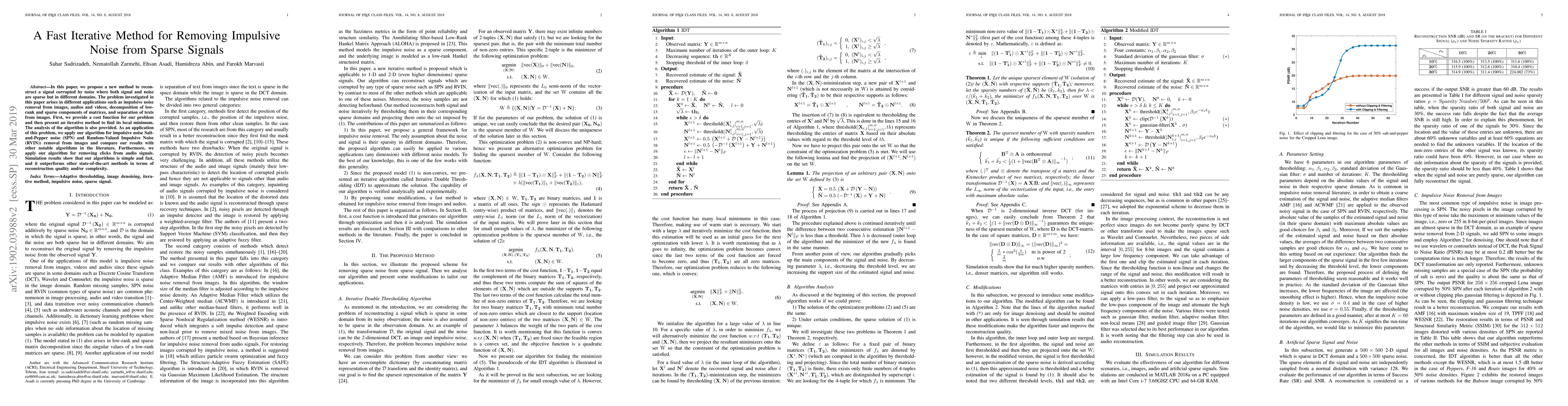 This paper introduces a fast iterative method for reconstructing sparse signals corrupted by impulsive noise, applicable to various domains like image, audio, and video denoising. The proposed algorithm outperforms existing methods in terms of reconstruction quality and computational efficiency.